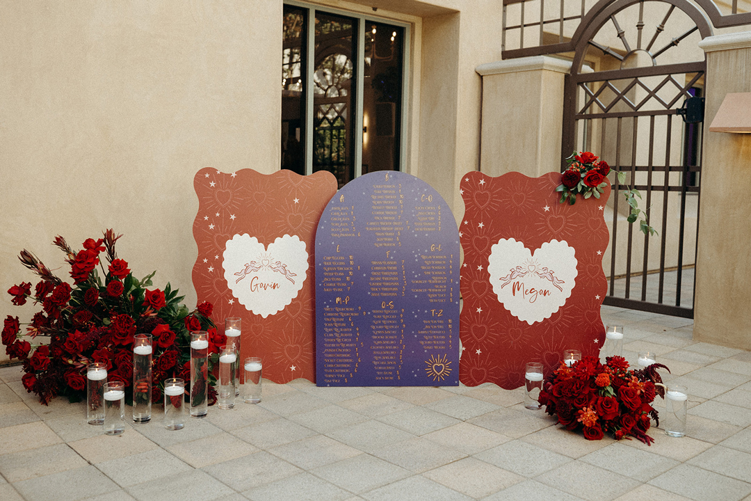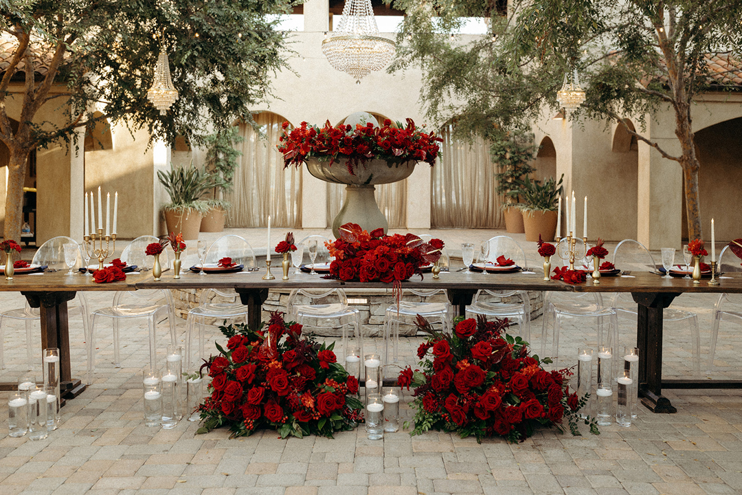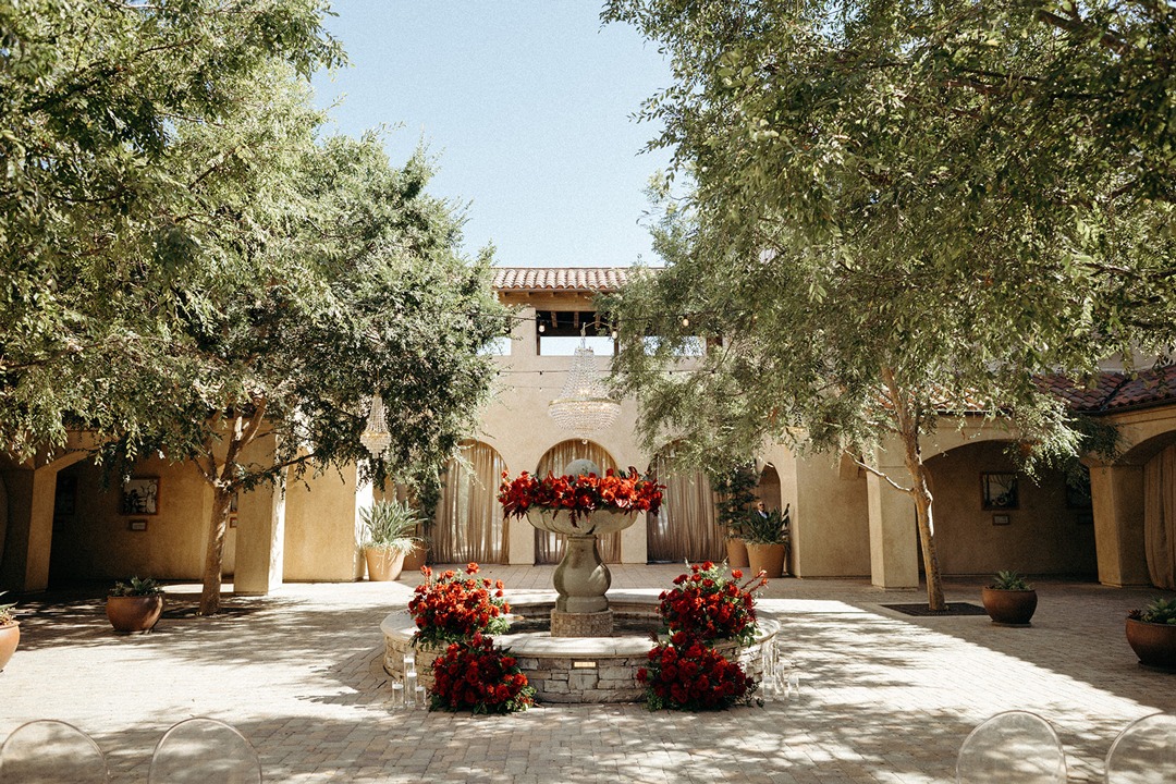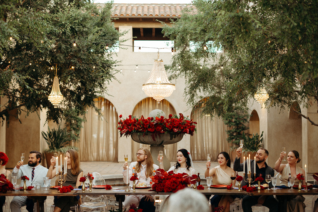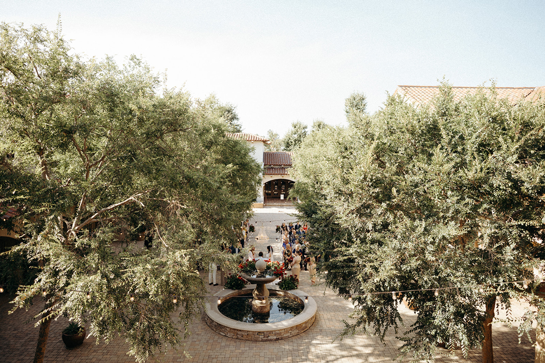 Gavin and Megan shared their first look, posed for photos with their bridal party, then lined up for their ceremony inside the Serra Plaza Courtyard. Guests signed Megan and Gavins guest book and found their seats facing the Spanish fountain decorated in red flowers. Once everyone was in attendance, music filled the air, and the wedding party made their entrances. In front of all their friends and family, the bride and groom recited their vows, exchanged rings, and sealed the ceremony with a kiss.
