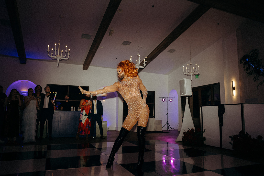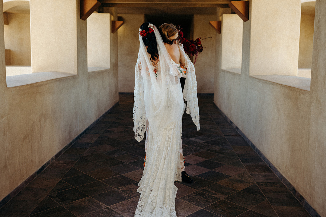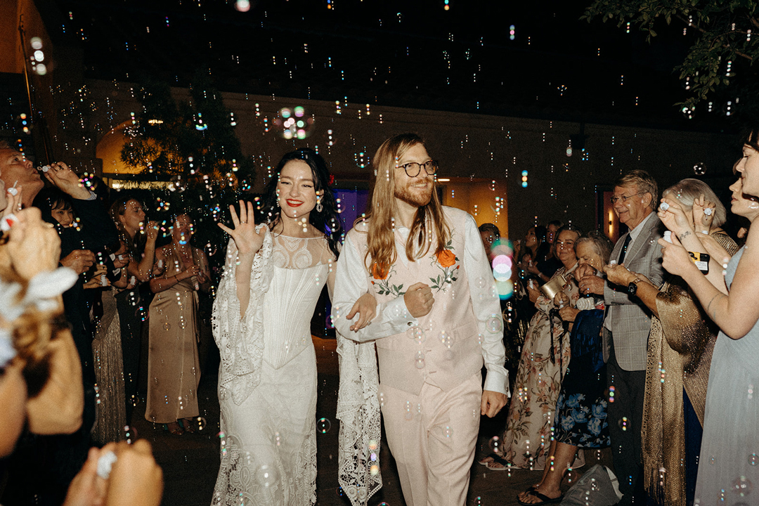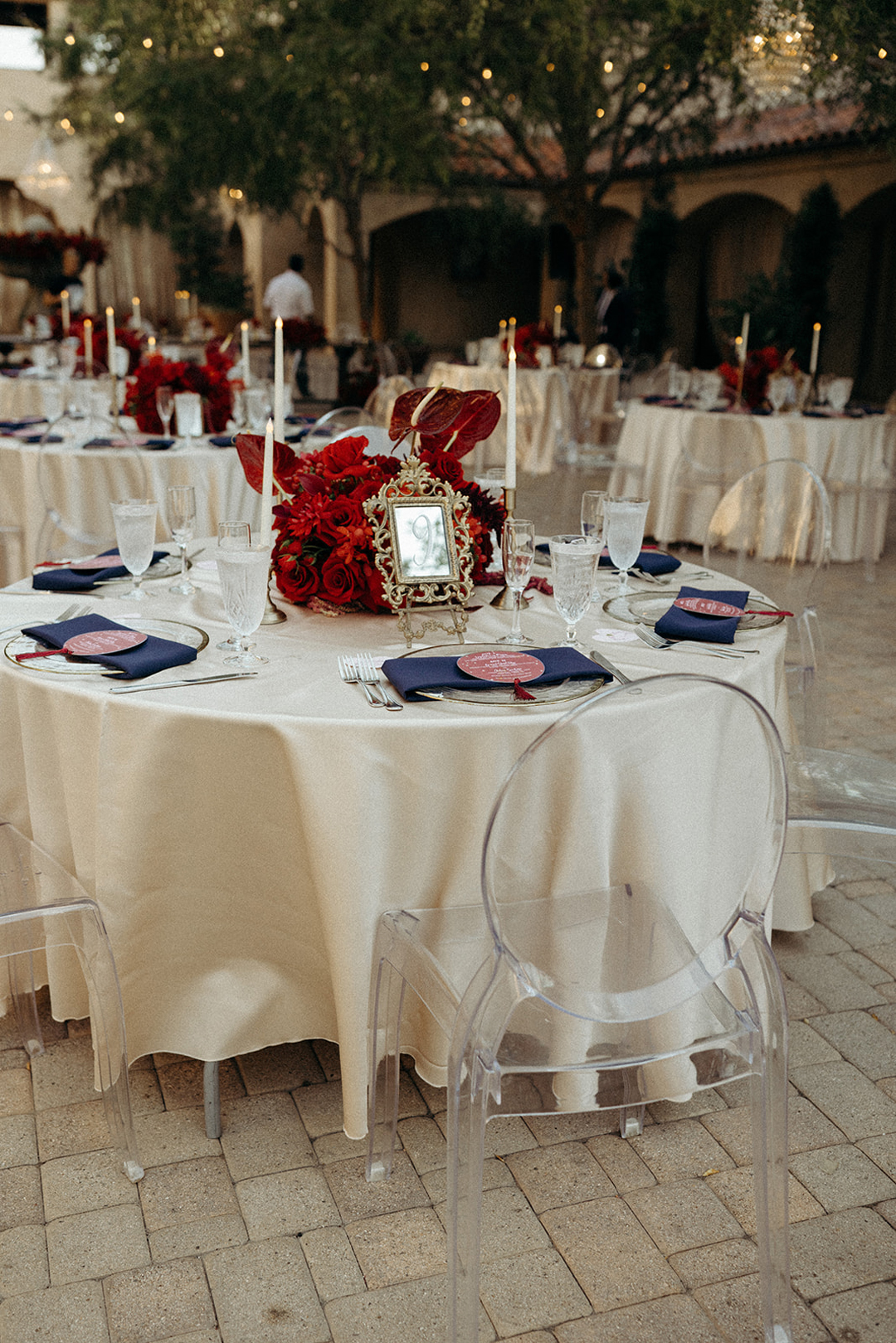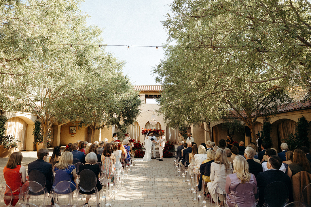 Gavin and Megan shared their first look, posed for photos with their bridal party, then lined up for their ceremony inside the Serra Plaza Courtyard. Guests signed Megan and Gavins guest book and found their seats facing the Spanish fountain decorated in red flowers. Once everyone was in attendance, music filled the air, and the wedding party made their entrances. In front of all their friends and family, the bride and groom recited their vows, exchanged rings, and sealed the ceremony with a kiss.