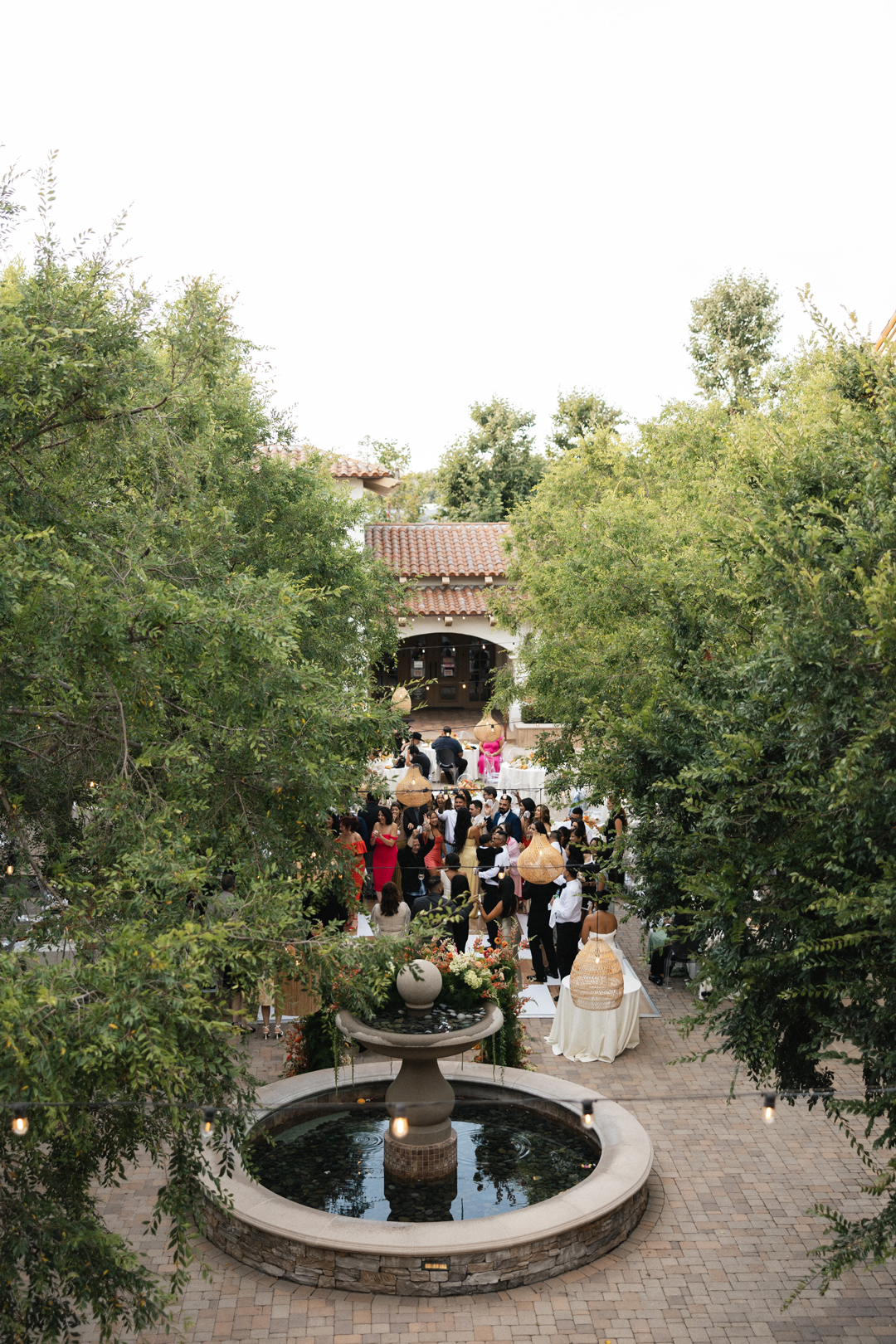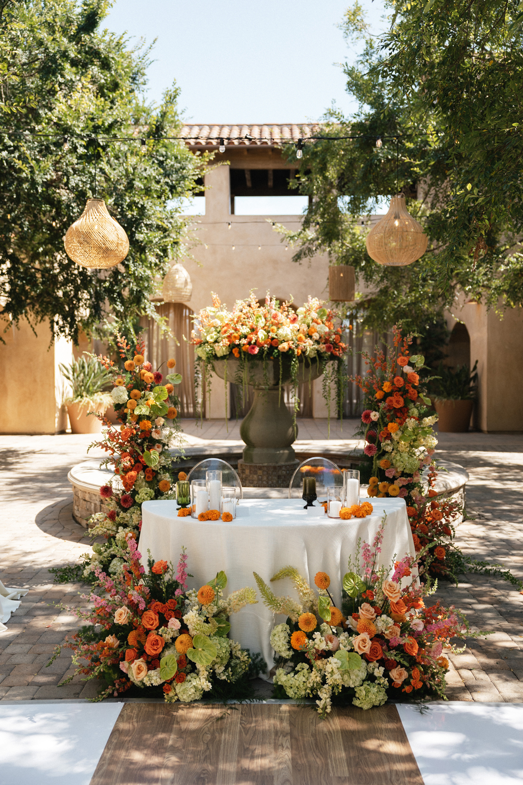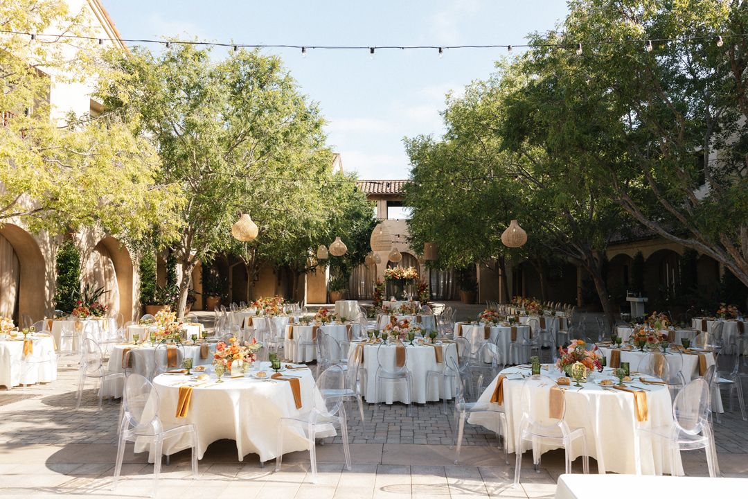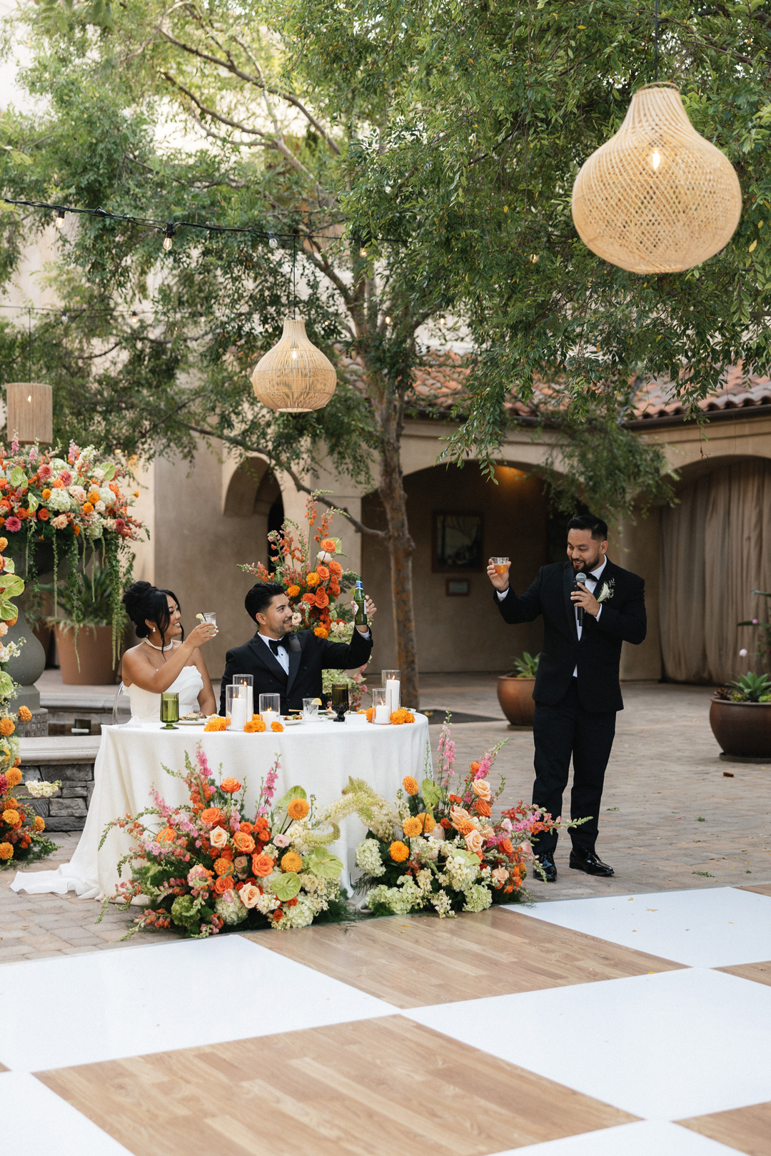 Abigail and Daniel started their day tying the knot at the Mission Basilica, then headed back to Serra Plaza to continue their wedding celebration with cocktail hour and reception. A live mariachi band serenaded guests as they entered Serra Plaza’s Lounge and Hidden Terrace. Whiskey Sour and Coconut Mojito signature drinks were poured at the bar and tray passed Filet and Wild Mushroom Wellingtons and Fig, Goat Cheese, and Mascarpone Tarts made their rounds to hungry guests. A boho-inspired lounge with mustard, magenta, orange, and green details was situated in front of the Lounge fireplace where guests could sit back and socialize. While guests mixed and mingled, the newlyweds posed for photos with their bridesmaids and groomsmen under the Courtyard archways creating lasting memories they’ll cherish forever. After photos, the bride and groom joined their guests for cocktail hour posing for selfies and sharing their gratitude. As the hour came to a close, everyone checked the large white and green tile print seating chart install outside of the Lounge doors and took a seat under rattan pendant lights in the Courtyard.