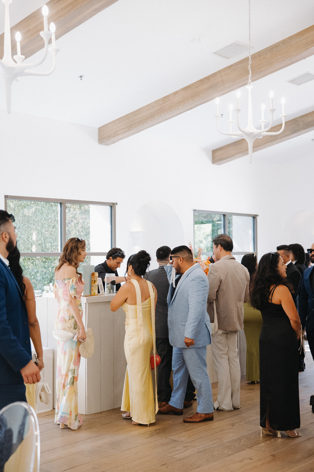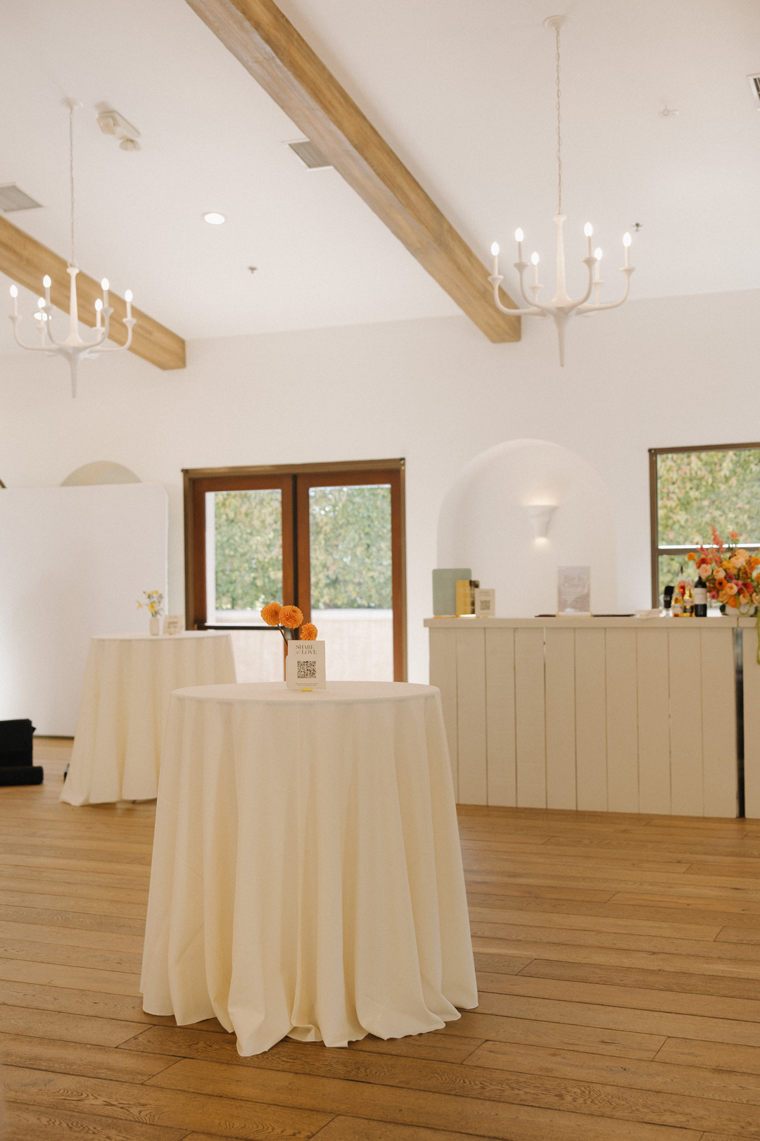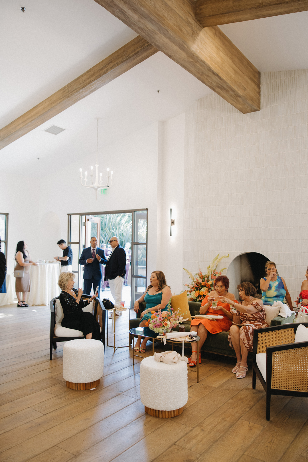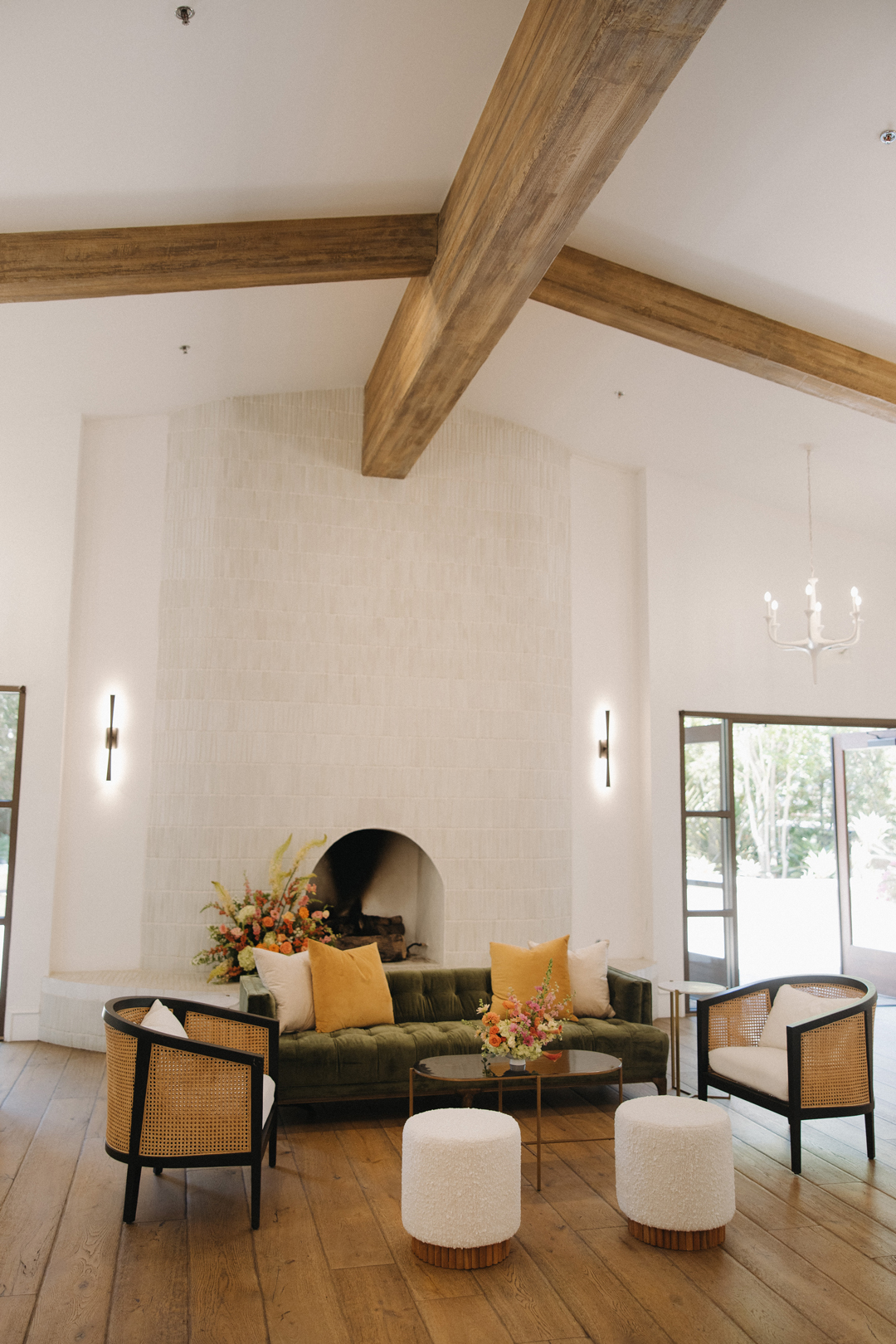 Abigail and Daniel started their day tying the knot at the Mission Basilica, then headed back to Serra Plaza to continue their wedding celebration with cocktail hour and reception. A live mariachi band serenaded guests as they entered Serra Plaza’s Lounge and Hidden Terrace. Whiskey Sour and Coconut Mojito signature drinks were poured at the bar and tray passed Filet and Wild Mushroom Wellingtons and Fig, Goat Cheese, and Mascarpone Tarts made their rounds to hungry guests. A boho-inspired lounge with mustard, magenta, orange, and green details was situated in front of the Lounge fireplace where guests could sit back and socialize. While guests mixed and mingled, the newlyweds posed for photos with their bridesmaids and groomsmen under the Courtyard archways creating lasting memories they’ll cherish forever. After photos, the bride and groom joined their guests for cocktail hour posing for selfies and sharing their gratitude. As the hour came to a close, everyone checked the large white and green tile print seating chart install outside of the Lounge doors and took a seat under rattan pendant lights in the Courtyard.