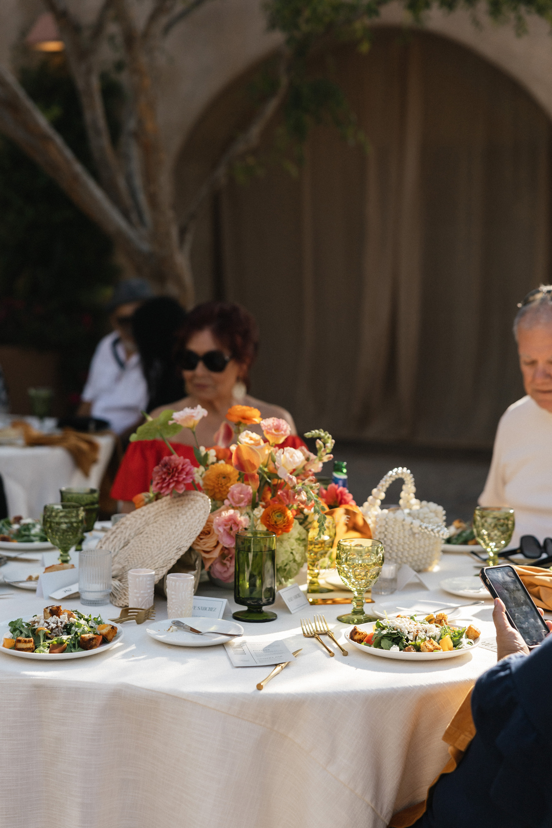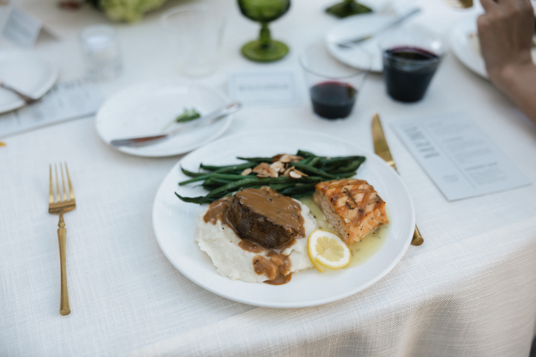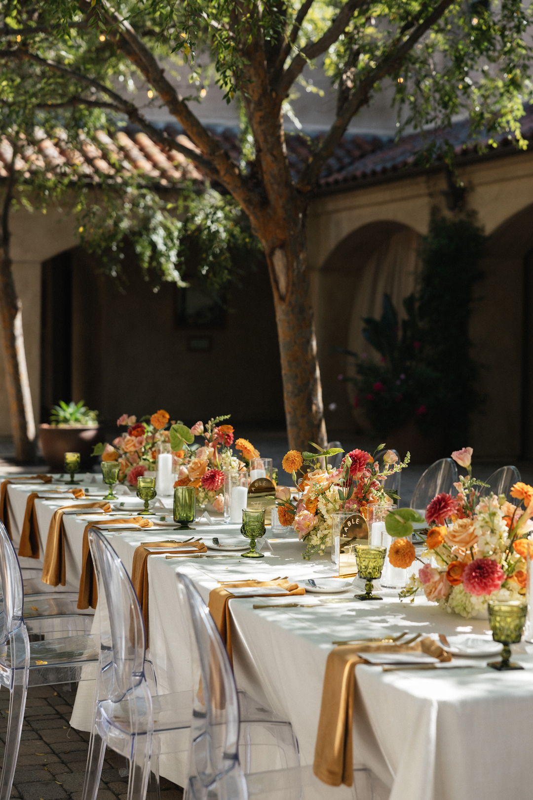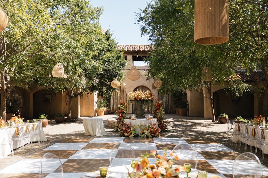 Colorful floral arrangements topped tables and added pops of orange, green, and pink to the Courtyard transforming it into a boho setting. Green goblets, gold table numbers, caramel-colored velvet napkins, and printed menus completed each tablescape. A wooden and white checkered dance floor was situated in front of the sweetheart table framed in by tall floral pillars. Once everyone was seated, Daniel and Abigail made their grand entrance, shared their first dance, and took a seat. Grilled Panzanella Salad was served followed by plated Classic Filet Mignon and Roasted Atlantic Salmon Fillet with Haricot Verts and Gourmet Mashed Potatoes. The dinner menu was selected by the bride and groom with help from our event specialist, Lauren. After dinner, the couple cut into their wedding cake and invited everyone to indulge in our Gourmet Dessert Station with a collection of Mini Lemon Meringue Tarts, Berry Champagne Macarons, Raspberry Chocolate Decadence, Mini Carrot Cupcakes, and Caramel Cream with Lemon Curd and Praline Crisp Dessert Shots. The evening ended with everyone having the time of their lives out on the dance floor while snacking on Late Night Mini Corn Dogs and Meat Lovers Mini Pizzas and sharing their well wishes with the newlyweds.