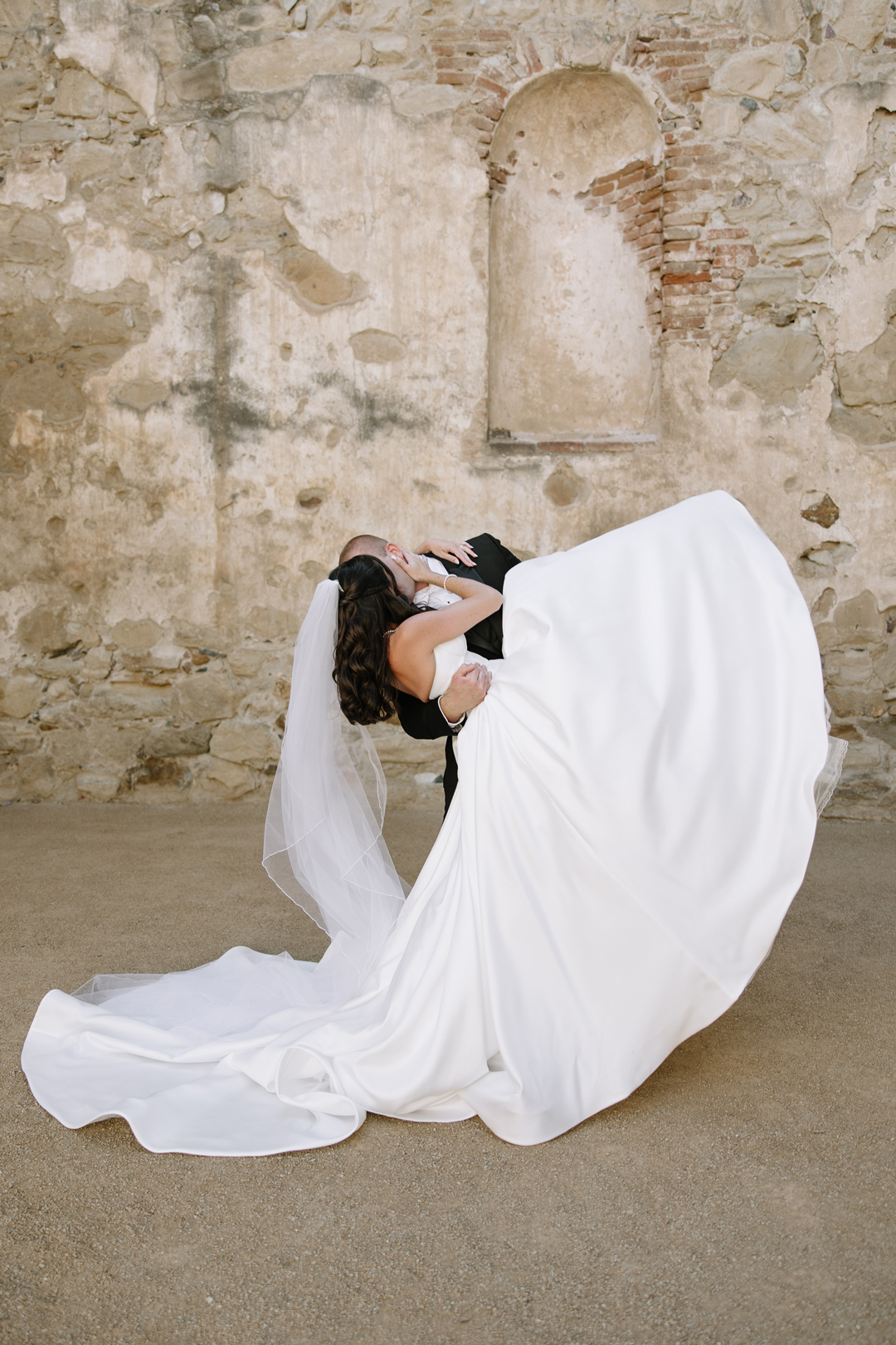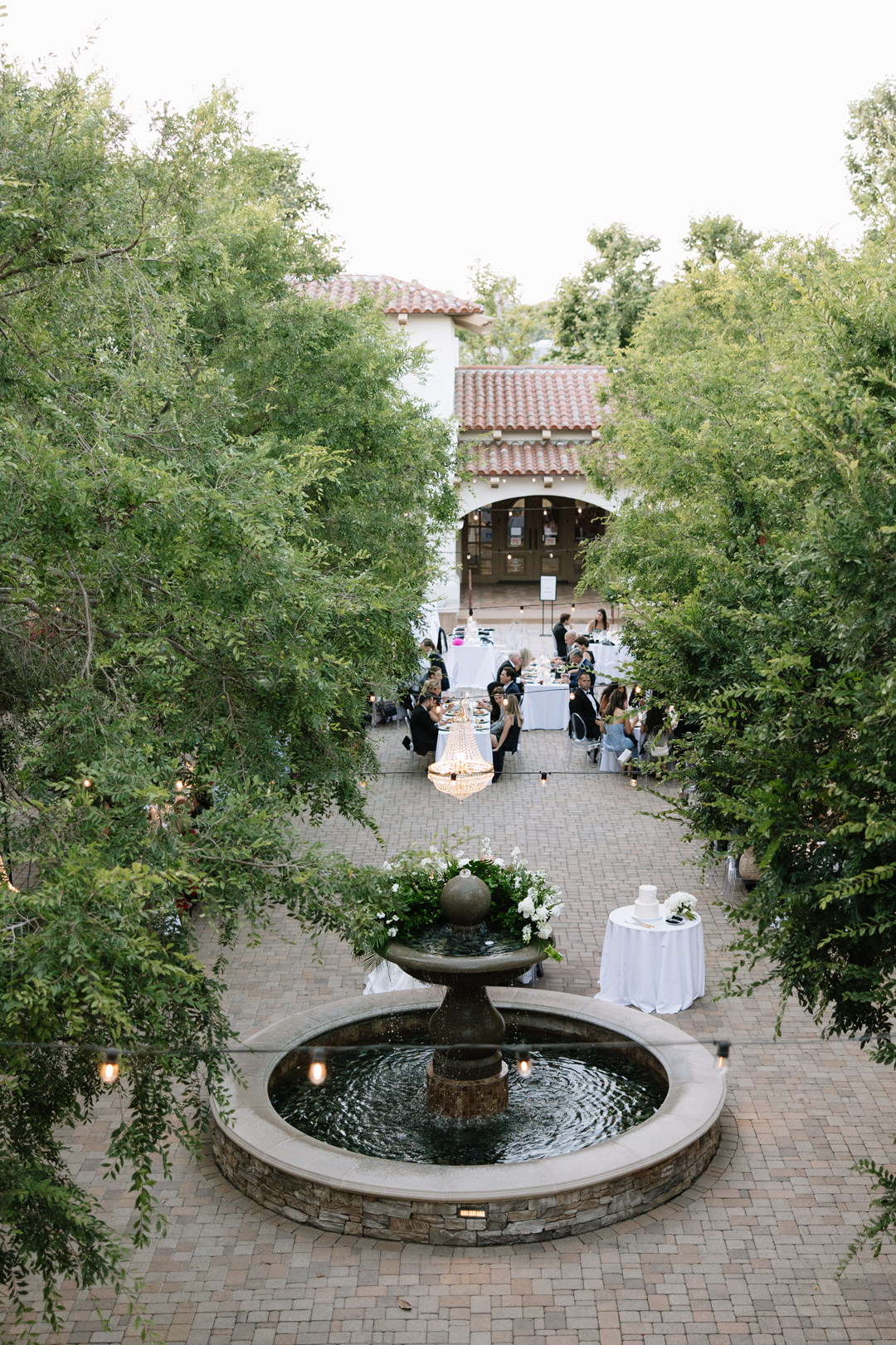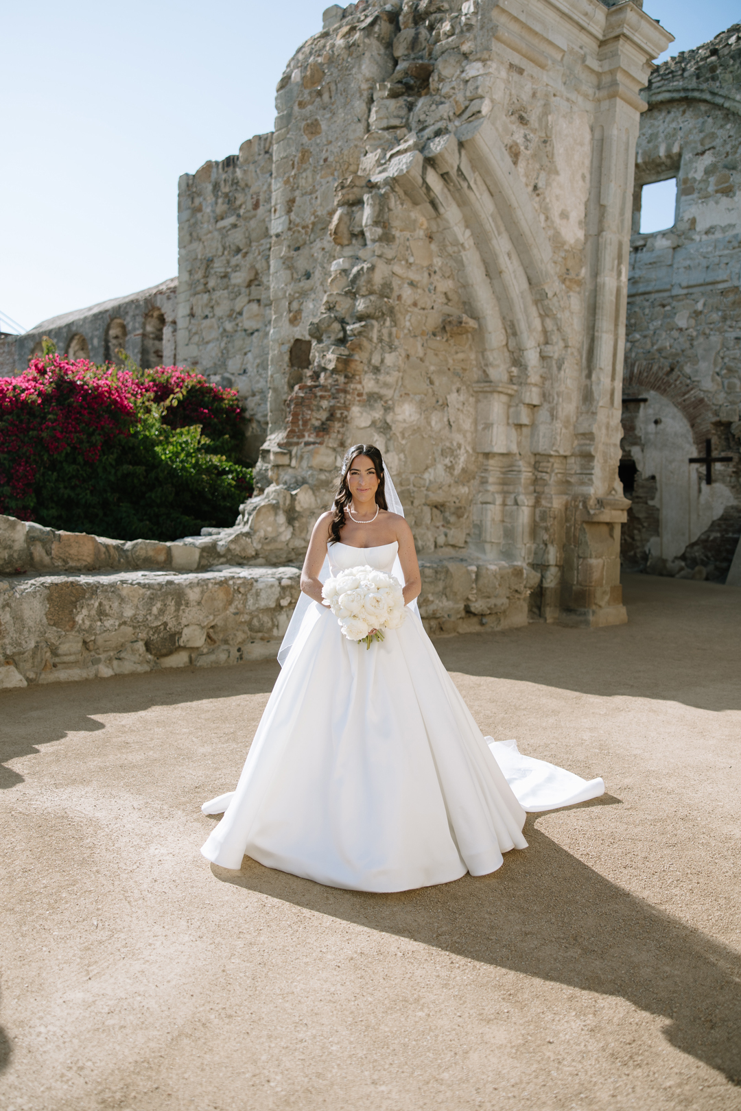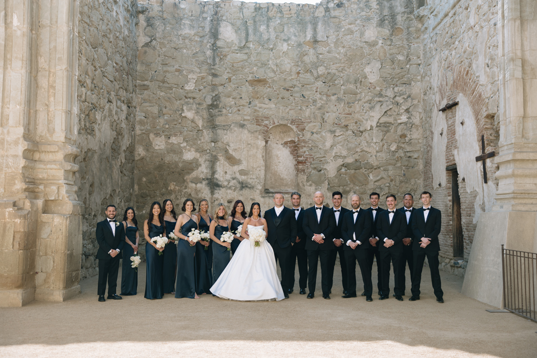 Brittany and her bridesmaids got ready inside the Serra Plaza Bridal Suite, joined everyone and Michael for the wedding ceremony over at the Mission Basilica, then posed for photos at Mission San Juan Capistrano. The bridesmaids were dressed in deep green dresses, and the guys were suited up in black. Group pictures were taken against the historic Mission backdrop, then the bride and groom smiled for the camera together. Once all the wedding party photos had been taken, everyone headed back to Serra Plaza for cocktail hour.