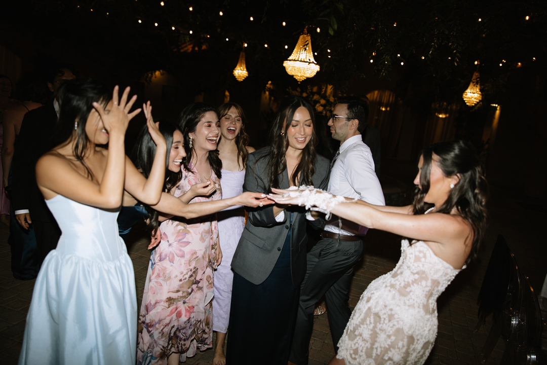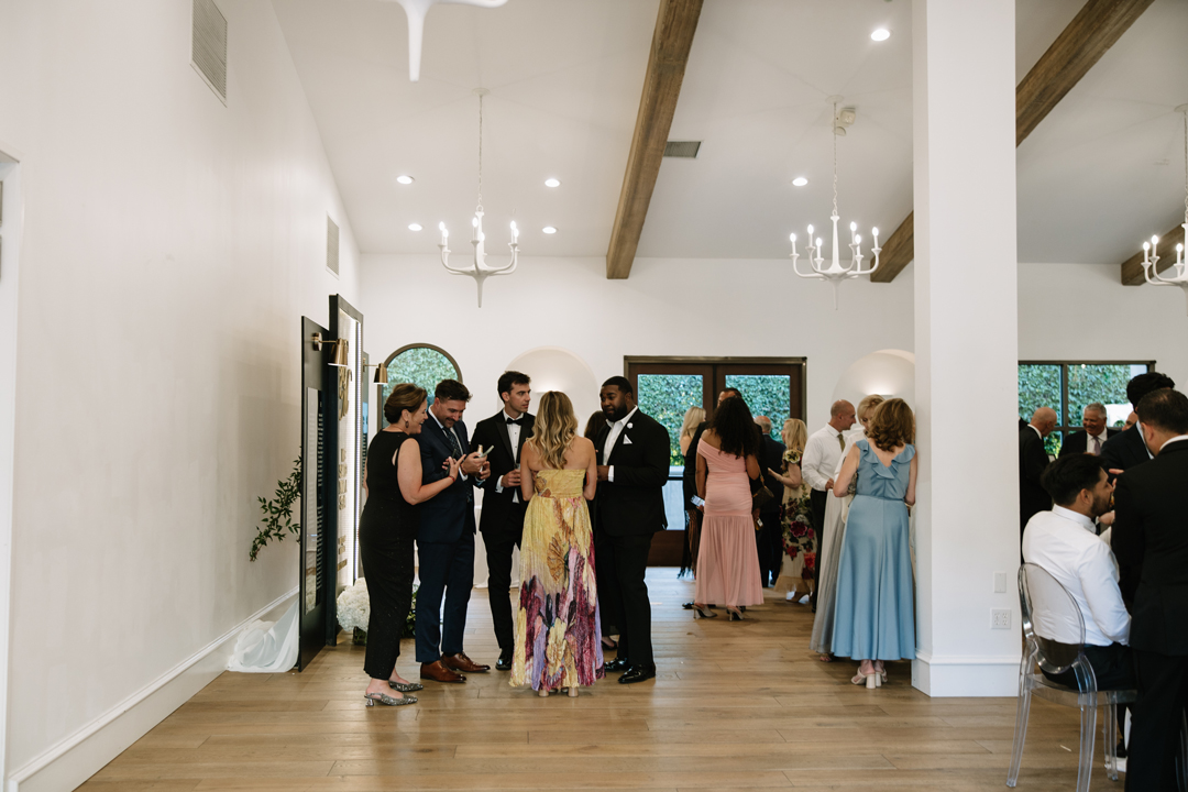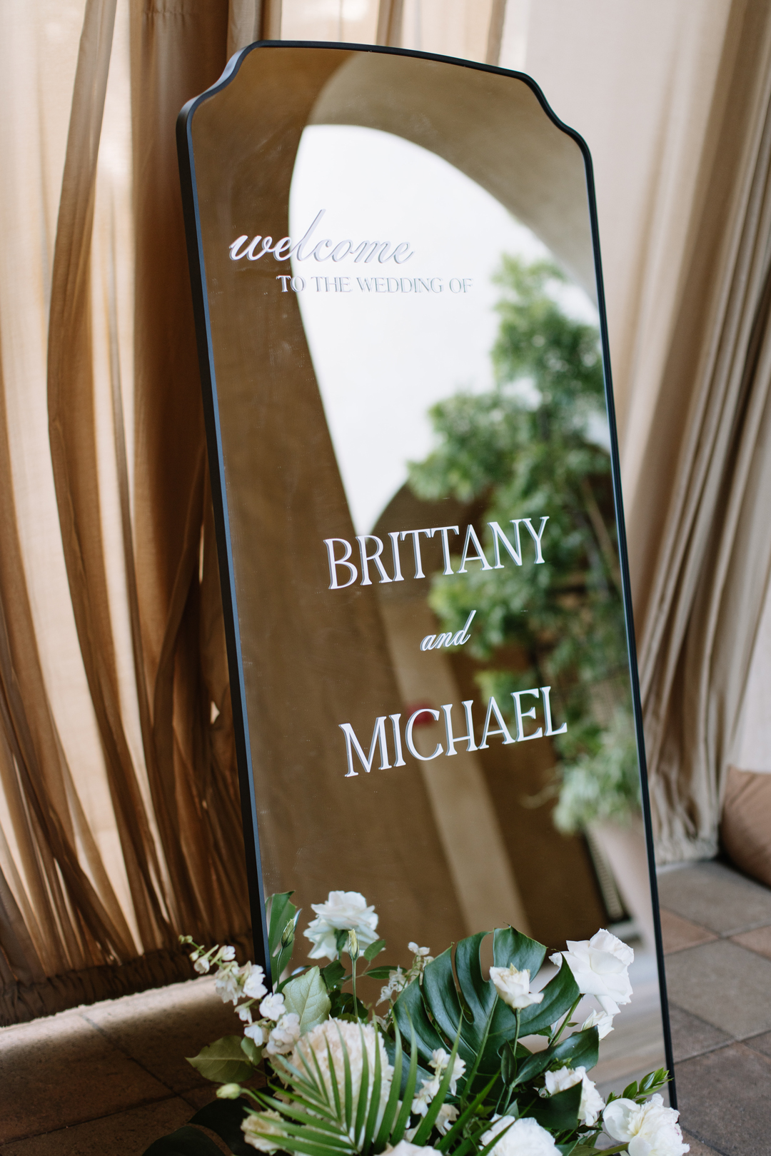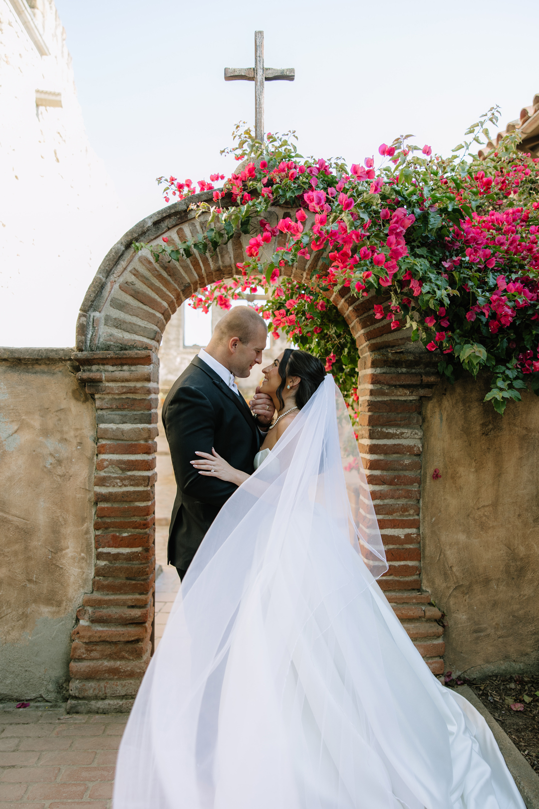 Brittany and her bridesmaids got ready inside the Serra Plaza Bridal Suite, joined everyone and Michael for the wedding ceremony over at the Mission Basilica, then posed for photos at Mission San Juan Capistrano. The bridesmaids were dressed in deep green dresses, and the guys were suited up in black. Group pictures were taken against the historic Mission backdrop, then the bride and groom smiled for the camera together. Once all the wedding party photos had been taken, everyone headed back to Serra Plaza for cocktail hour.