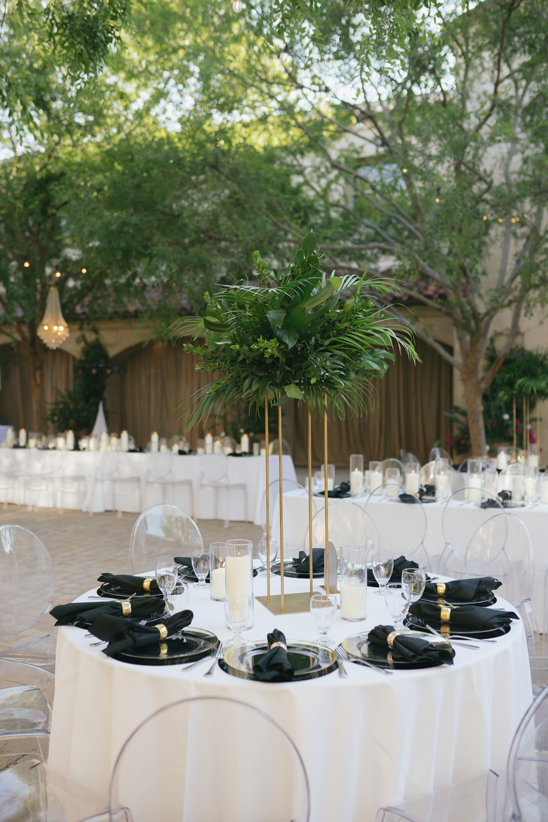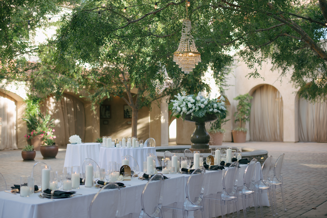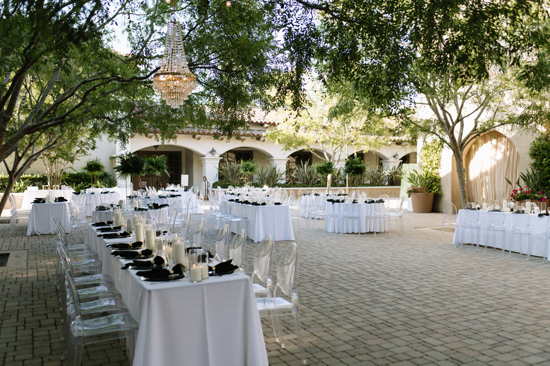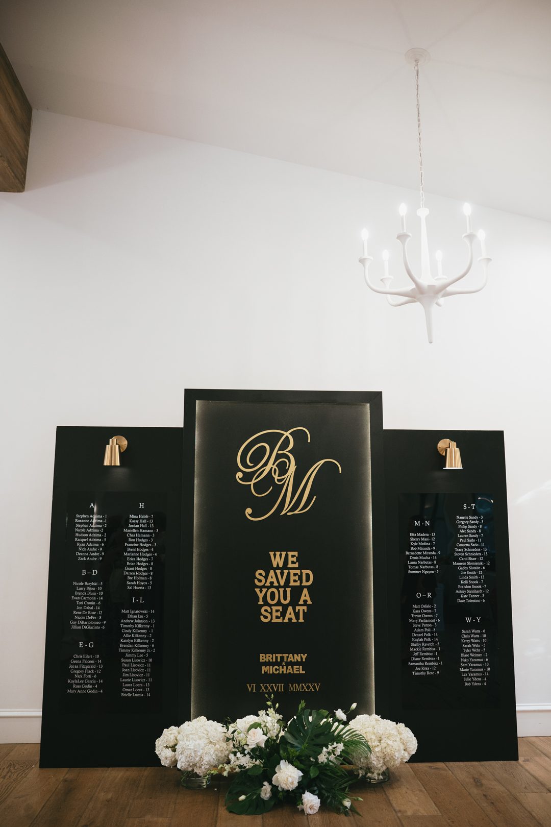 Old Fashioned and Dirty Martini signature drinks were served in the Lounge while Filet and Wild Mushroom Wellingtons, Thai Vegetable Spring Rolls, and Fig, Goat Cheese and Mascarpone Tarts were tray passed. Everyone mixed and mingled until it was time to head out to the Courtyard. A black and gold modern seating chart display stood tall showing guests which tables they were seated at as they headed out the Lounge doors.