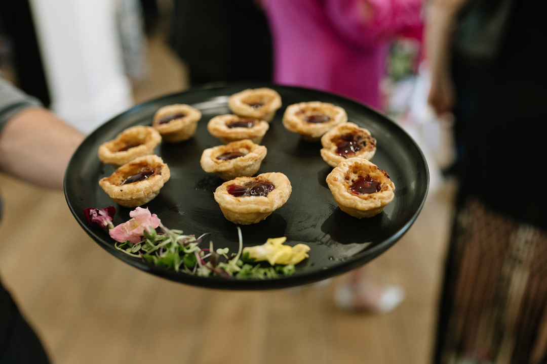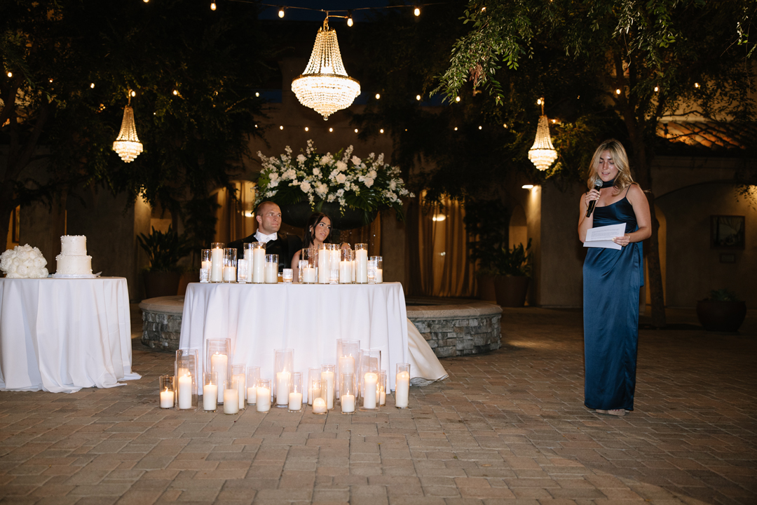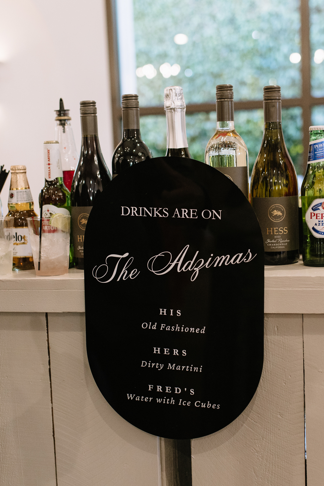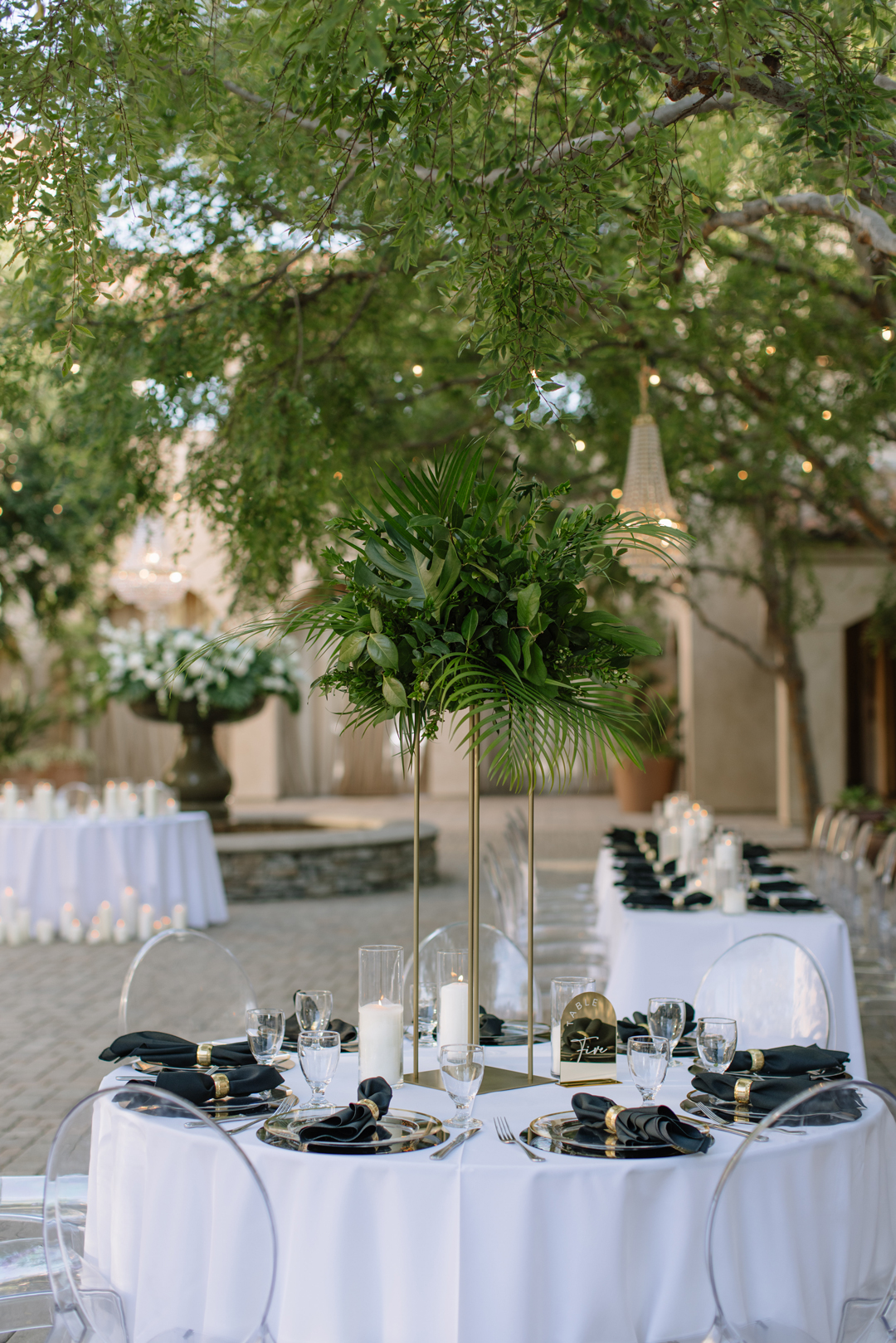 Old Fashioned and Dirty Martini signature drinks were served in the Lounge while Filet and Wild Mushroom Wellingtons, Thai Vegetable Spring Rolls, and Fig, Goat Cheese and Mascarpone Tarts were tray passed. Everyone mixed and mingled until it was time to head out to the Courtyard. A black and gold modern seating chart display stood tall showing guests which tables they were seated at as they headed out the Lounge doors.