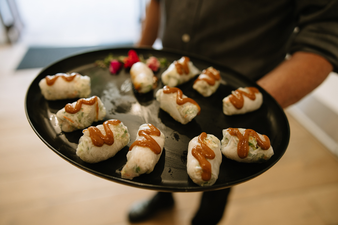 Chandeliers sparkled above tables topped with white candles and tropical greenery centerpieces. Back and gold accents completed the modern meets tropical décor. Brittany and Michael made their grand entrance, shared their first dance, then took a seat at their sweetheart table. Chicken Marsala, Cabernet Braised Short Ribs, Vegetarian Rotolo Bolzano, Mashed Potatoes, Grilled Marinated Vegetables, and Caesar Salad were served while family and friends shared toasts. The dinner menu was selected by the bride and groom with help from our event specialist, Selena. After dinner, the newlyweds cut into our Chocolate Cake with Salted Caramel Mousse and invited their guests to indulge in a slice. The evening ended with everyone out on the dance floor showing off their moves, sacking on Gloria’s Caramelized Bacon Wrapped Franks and Fried Chicken and Waffle Bites Late Night Snacks, and sharing their well wishes with Michael and Brittany.