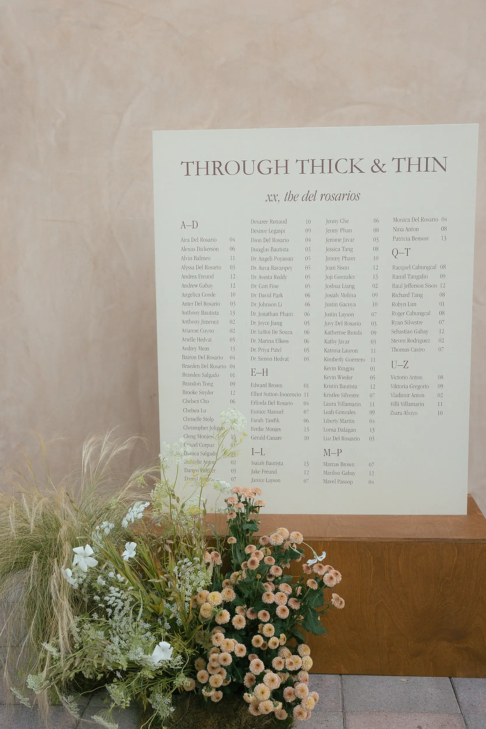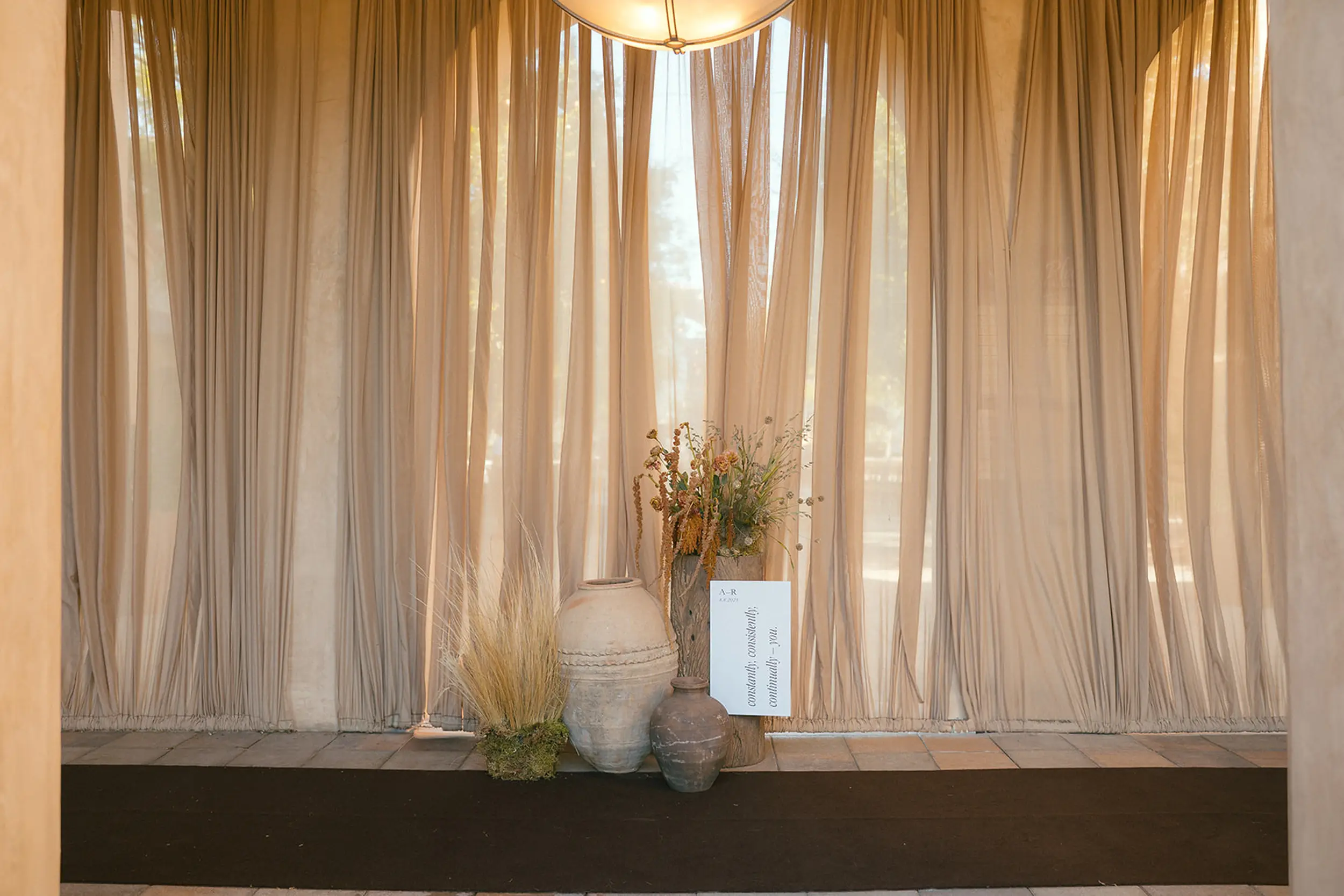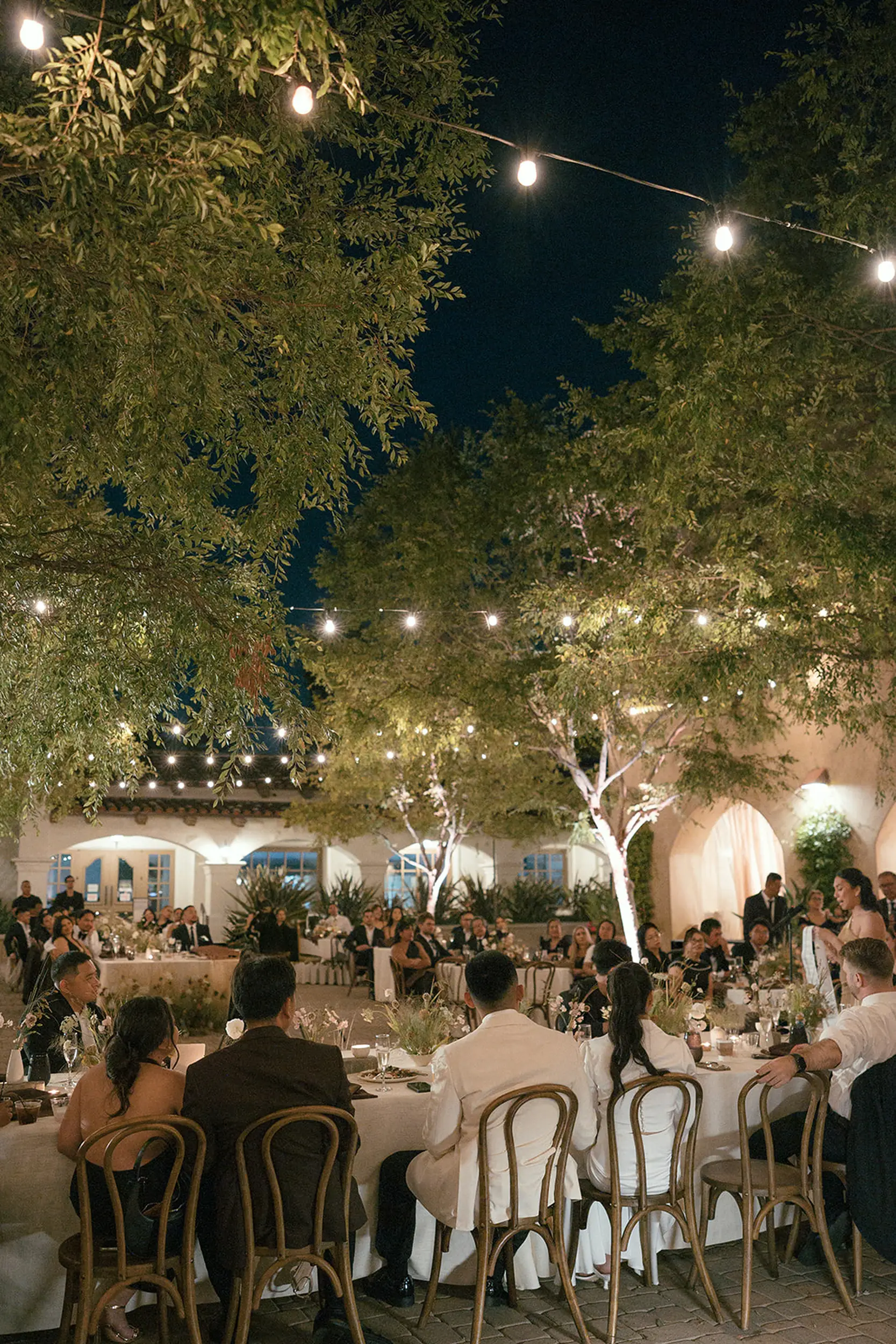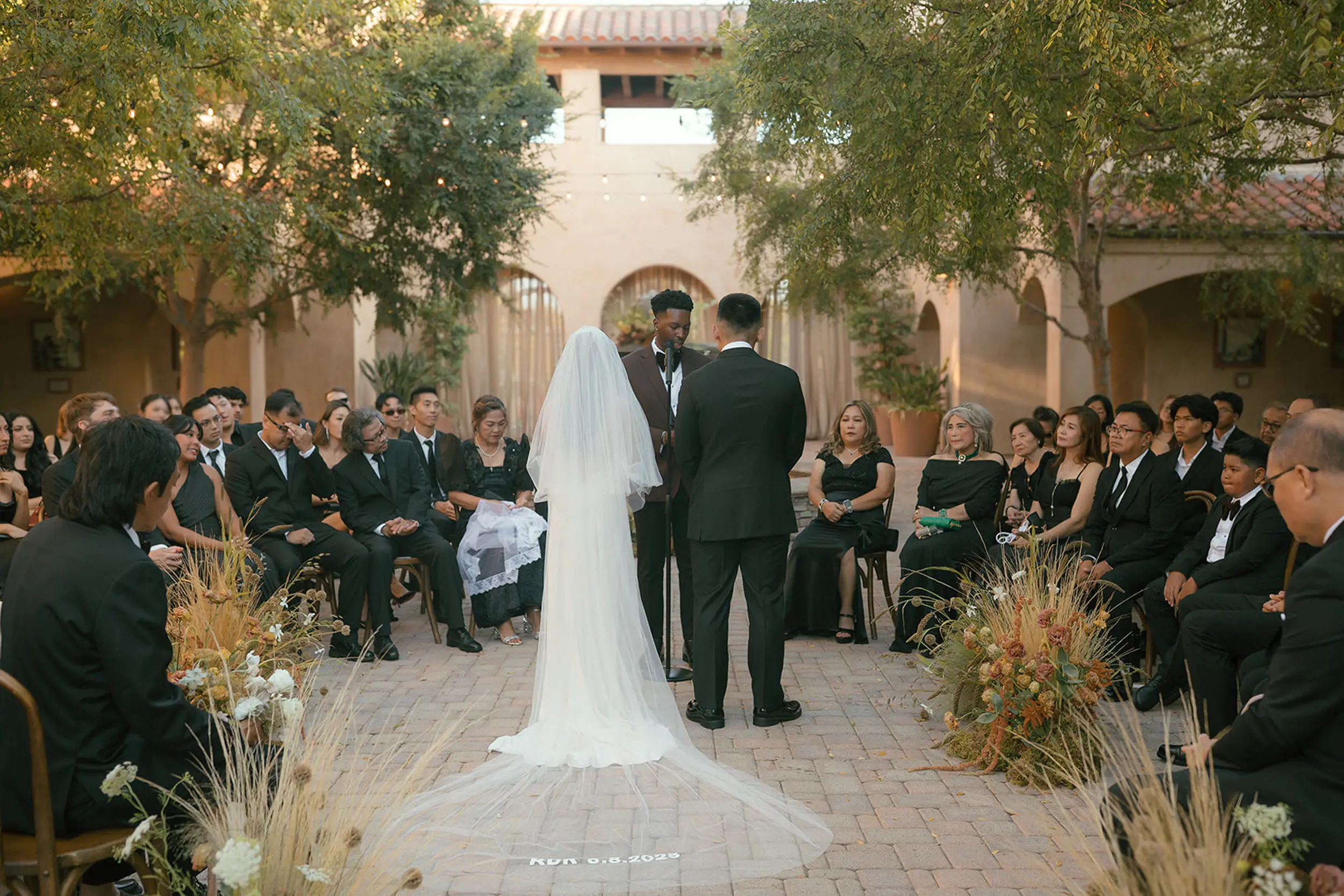 Rachael, Aniel, and their bridesmaids and groomsmen dressed in black and brown neutrals lined up for ceremony as guests made their way into the Serra Plaza Courtyard. Through the iron gates and past the wedding welcome sign complete with clay pots and dried florals, the Courtyard sat ready for a romantic wedding. Wooden bentwood chairs were arranged in a circular shape with the Spanish fountain as the ceremony backdrop. A mix of tall grass, moss, and rust and white florals decorated the space lining the aisle and marking where the bride and groom would soon stand. Once everyone was seated, the wedding party made their entrances ending with Rachael. In front of all their closest friends and loving family, Rachael and Aniel recited their vows, exchanged rings, and sealed the ceremony with a kiss as guests cheered from their seats.