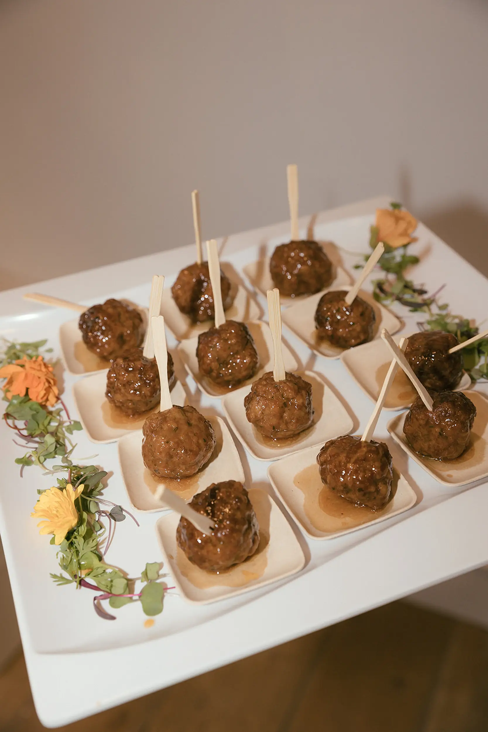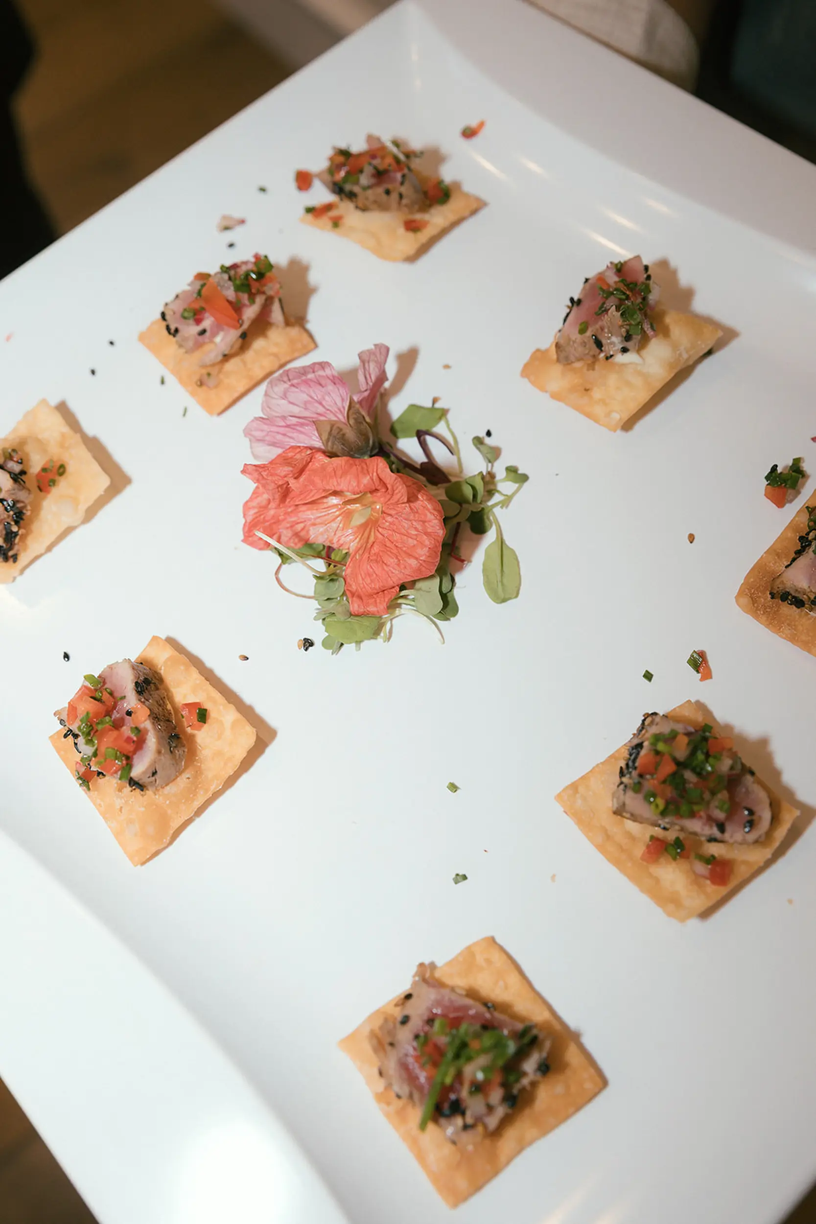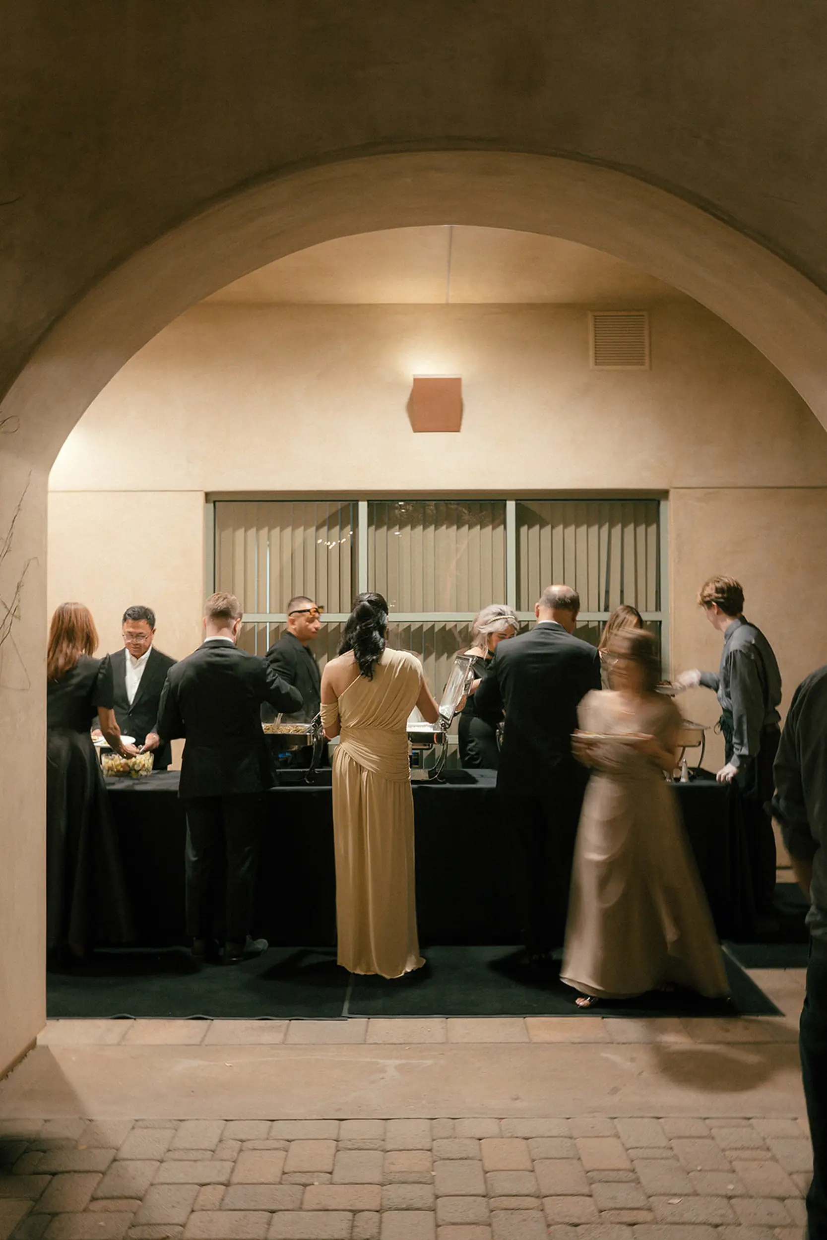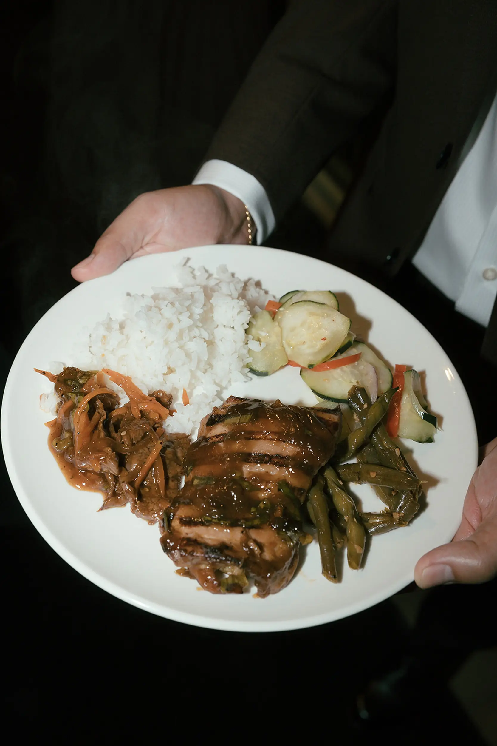 Tables were topped with ivory linens, brown napkins, printed menus and black water goblets. Floral centerpieces sprouted up from the center of each table and were arranged organically on the ground to look like small patches of meadows with pops of terracotta, tan, and white flowers. Aniel and Rachael made their grand entrance, shared their first dance, then took a seat at their head table. Toasts were shared and tables were excused one by one to the buffet where Korean Bulgogi Beef, Thai Three Flavored BBQ Chicken, Jasmine Rice, Asian Cucumber Salad, and Spicy Szechuan Green Beans were served. The dinner menu was selected by the bride and groom with help from our event specialist, Brittany. After dinner, the newlyweds cut into their personal wedding cake and invited everyone to indulge in our Kouign Amann station. The evening ended with lots of dancing, a late night snack of Meat Lovers Mini Pizzas, and many photos taken together to remember the celebration.