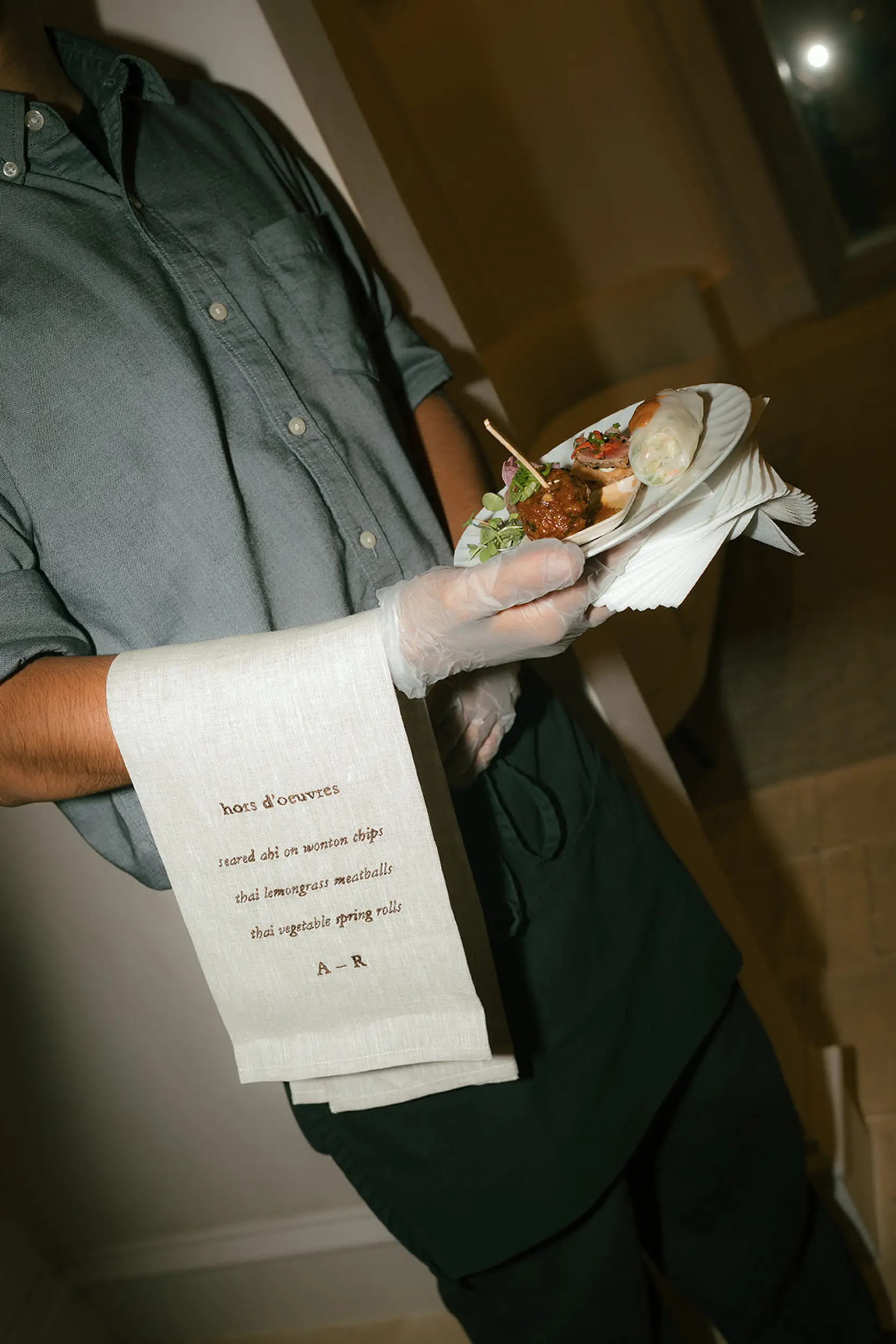 Cocktail hour was hosted inside where tables were topped with tan linens and a modern green and beige specialty lounge provided comfortable seating for guests as they sipped and snacked. The bar served Georgia Peach and Lychee Martini signature drinks while tray passed Thai Lemongrass Meatballs, Thai Vegetable Spring Rolls, and Seared Ahi on Wonton Chips made their rounds. Guests posed for selfies together, signed the newlywed’s guest book, and mingled until it was time to head back outside for the reception.
