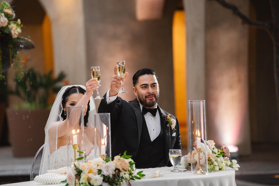 Emilie slipped into her wedding gown while Joseph suited up as guests arrived at Serra Plaza for the big day. Friends and family filed into the courtyard, signing the bride and groom’s guest book on their way in to take a seat. White, plum, orange, and yellow floral arrangements lined both sides of the aisle and more flowers spilled over the Spanish fountain. Once everyone was seated, the ceremony music began playing and the wedding party made their entrances. A tearful first look was shared between Emilie and Joseph as the bride closed out the processional. In front of all their closest friends and family, the bride and groom recited vows, exchanged rings, and sealed the ceremony with a kiss.