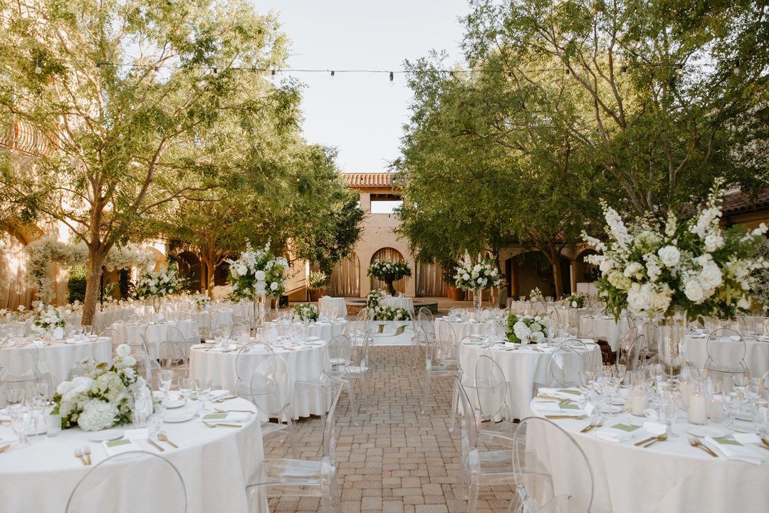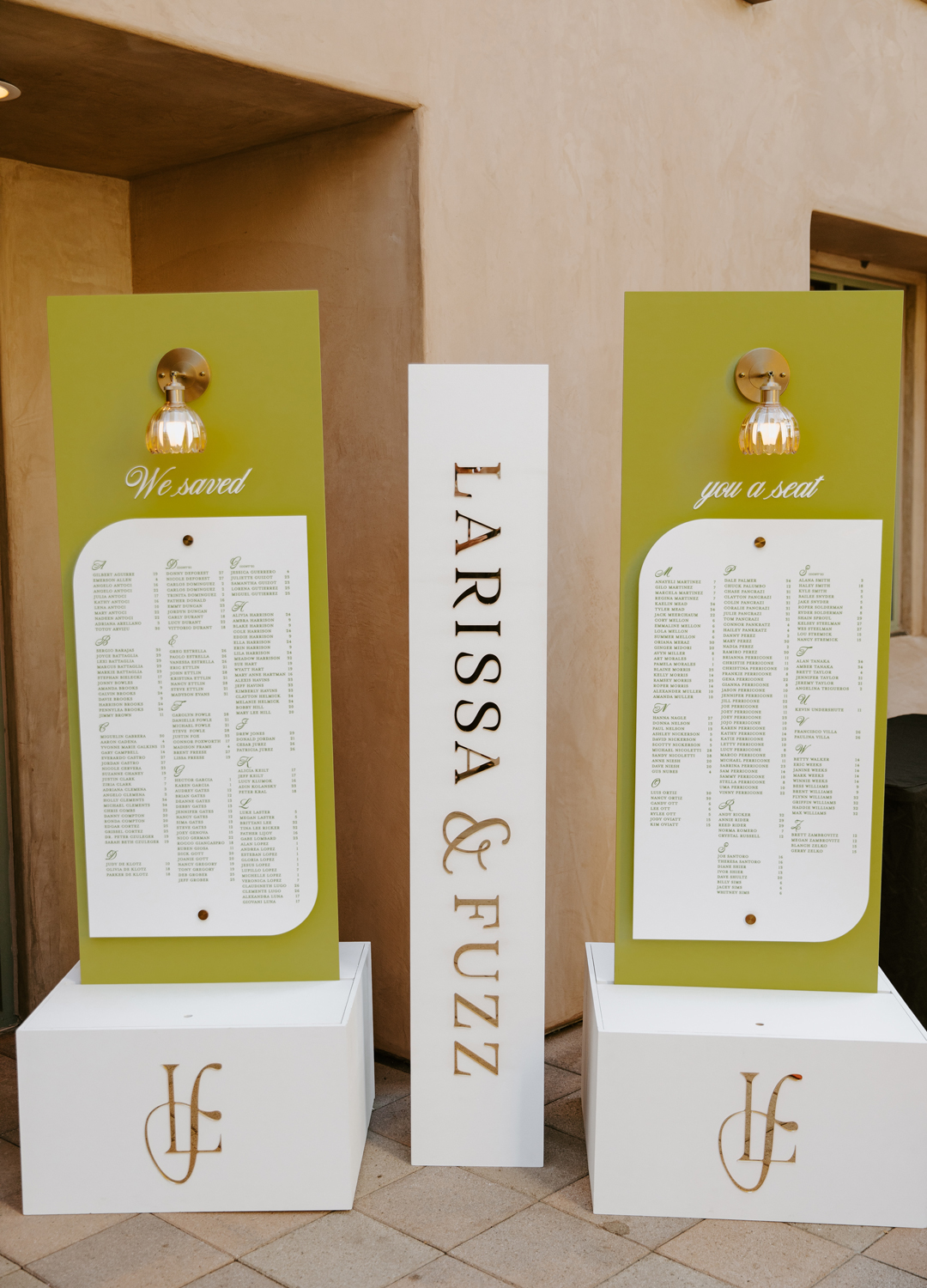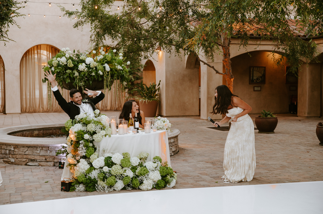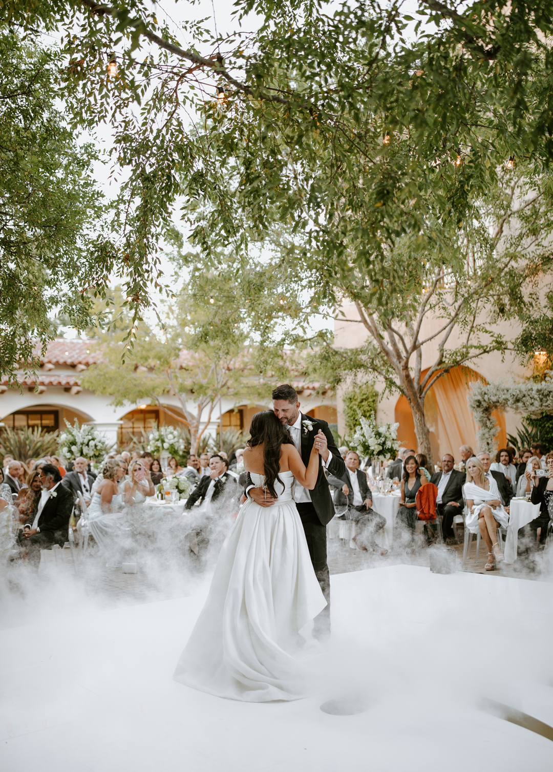 Larissa and Fuzz tied the knot at the Mission Basilica, posed for photos at The Mission, grabbed a drink at Swallows Inn, then joined their guests back at Serra Plaza for cocktail hour. Lemon Parmesan Artichoke Hearts, Caprese Skewers, and Grilled Baby Lamb Chops were tray passed around the Lounge while Aperol Spritz and Vodka Soda signature drinks were served at the bar. Everyone mixed and mingled until it was time to head out to the Courtyard for the reception.