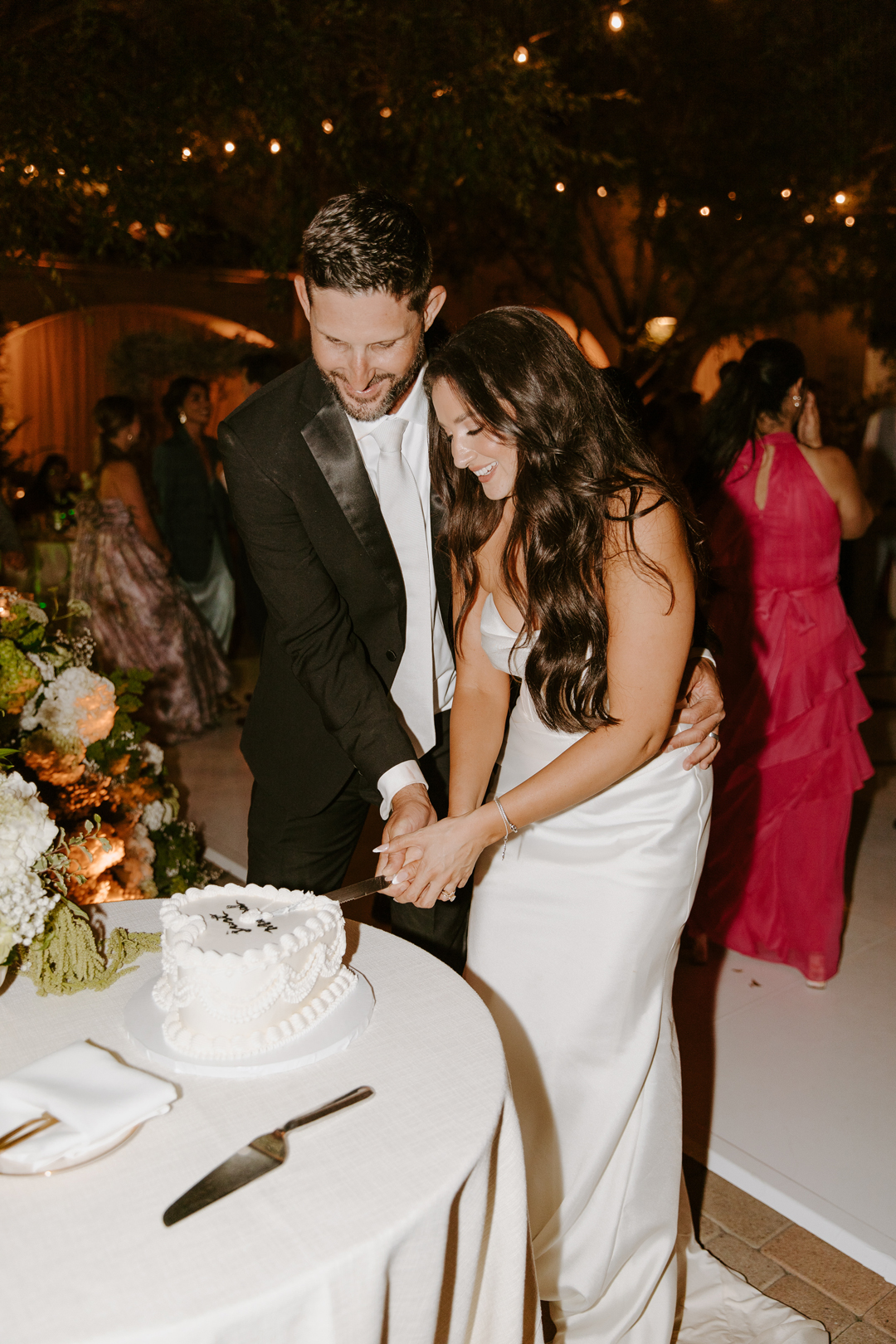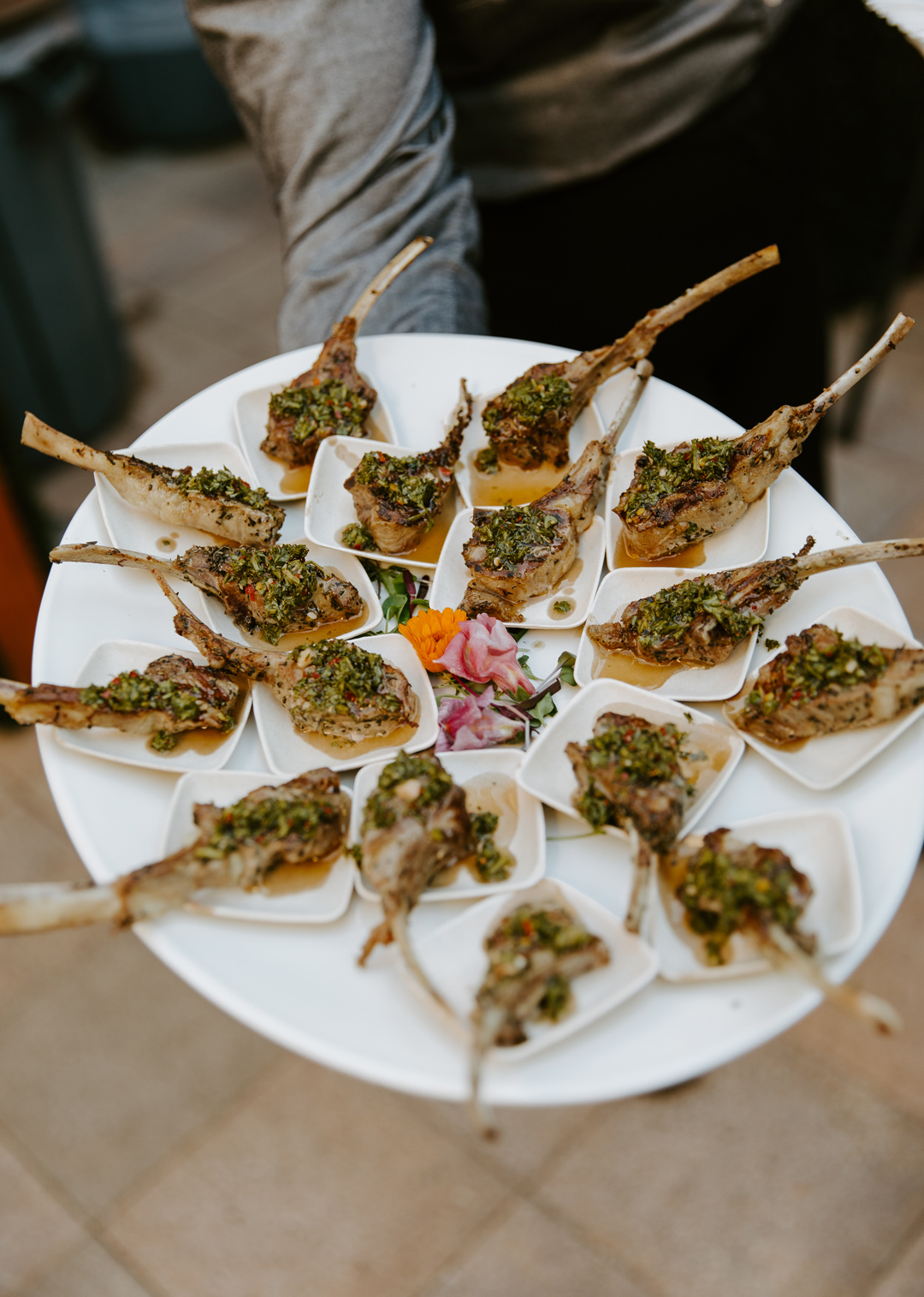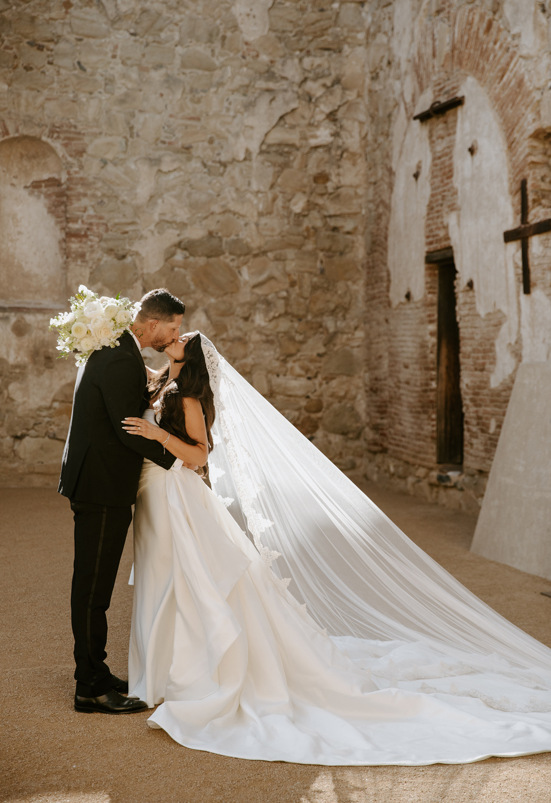 Larissa and Fuzz tied the knot at the Mission Basilica, posed for photos at The Mission, grabbed a drink at Swallows Inn, then joined their guests back at Serra Plaza for cocktail hour. Lemon Parmesan Artichoke Hearts, Caprese Skewers, and Grilled Baby Lamb Chops were tray passed around the Lounge while Aperol Spritz and Vodka Soda signature drinks were served at the bar. Everyone mixed and mingled until it was time to head out to the Courtyard for the reception.