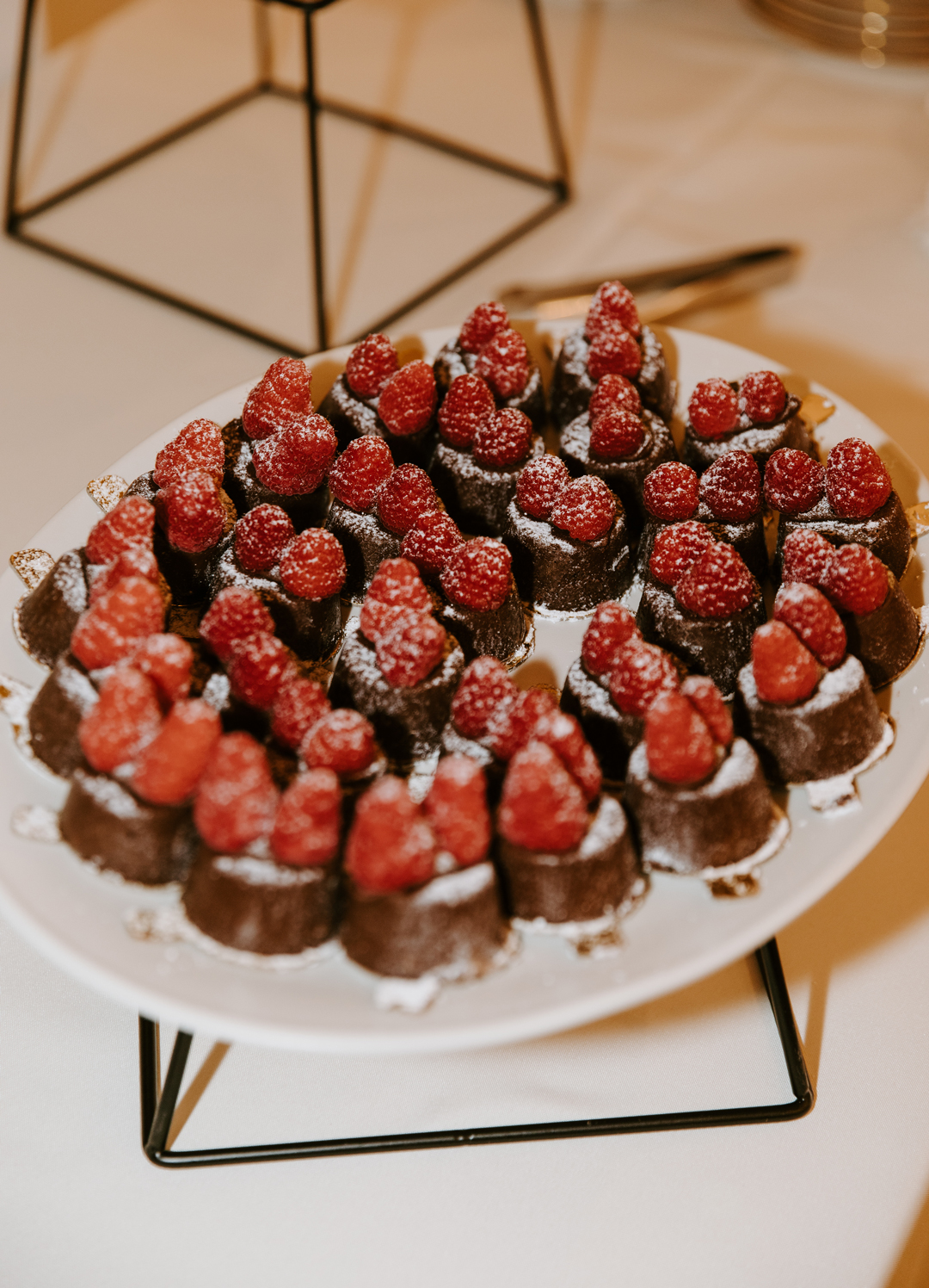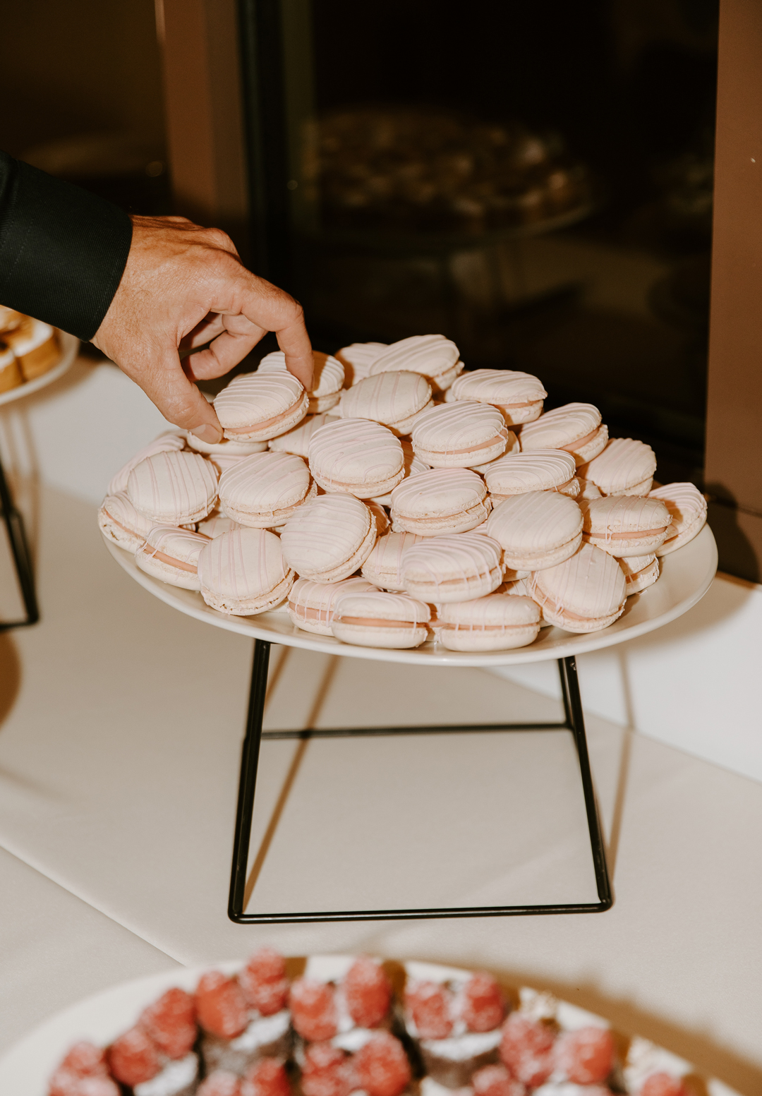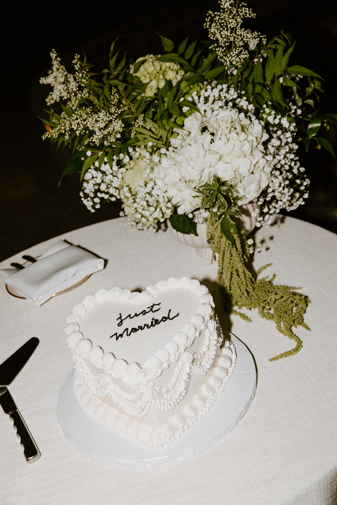 Tables were topped with white floral centerpieces, ceramic swallows, matching candles, and custom printed menus. Fuzz and Larissa made their grand entrance, shared their first dance, then took a seat at their sweetheart table. Caesar Salad was served while family and friends shared toasts, followed by Niman Ranch Prime Filet Mignon and Miso Glazed Alaskan Halibut with Wild Mushroom ad Black Truffle Pasta. The dinner menu was selected by the bride and groom with help from our event specialist, Selena. After dinner, the newlyweds cut into our Confetti Vintage Heart Cake and invited their guests to indulge in our Gourmet Dessert Station with a collection of Mini Lemon Meringue Tarts, Berry Champagne Macarons, Raspberry Chocolate Decadence, Mini Carrot Cupcakes, and Caramel Cream with Lemon Curd and Praline Dessert Shots. The evening ended with everyone out on the dance floor showing off their best moves and sharing their well wishes with Fuzz and Larissa.