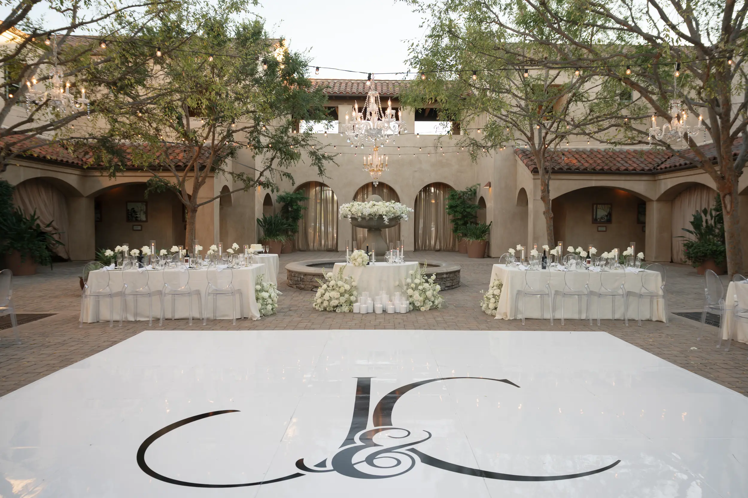 Guests made their way through Serra Plaza’s grand gates, signed Chris and Julia’s guest book, then found a seat in the Courtyard. White floral arrangements lined the aisle and decorated the Spanish fountain ahead while sparkling chandeliers hung above. Once everyone was seated, the wedding party made their entrances ending with Julia. In front of all their closest friends and loving family, Julia and Chris recited vows, exchanged rings, and sealed the ceremony with a kiss.